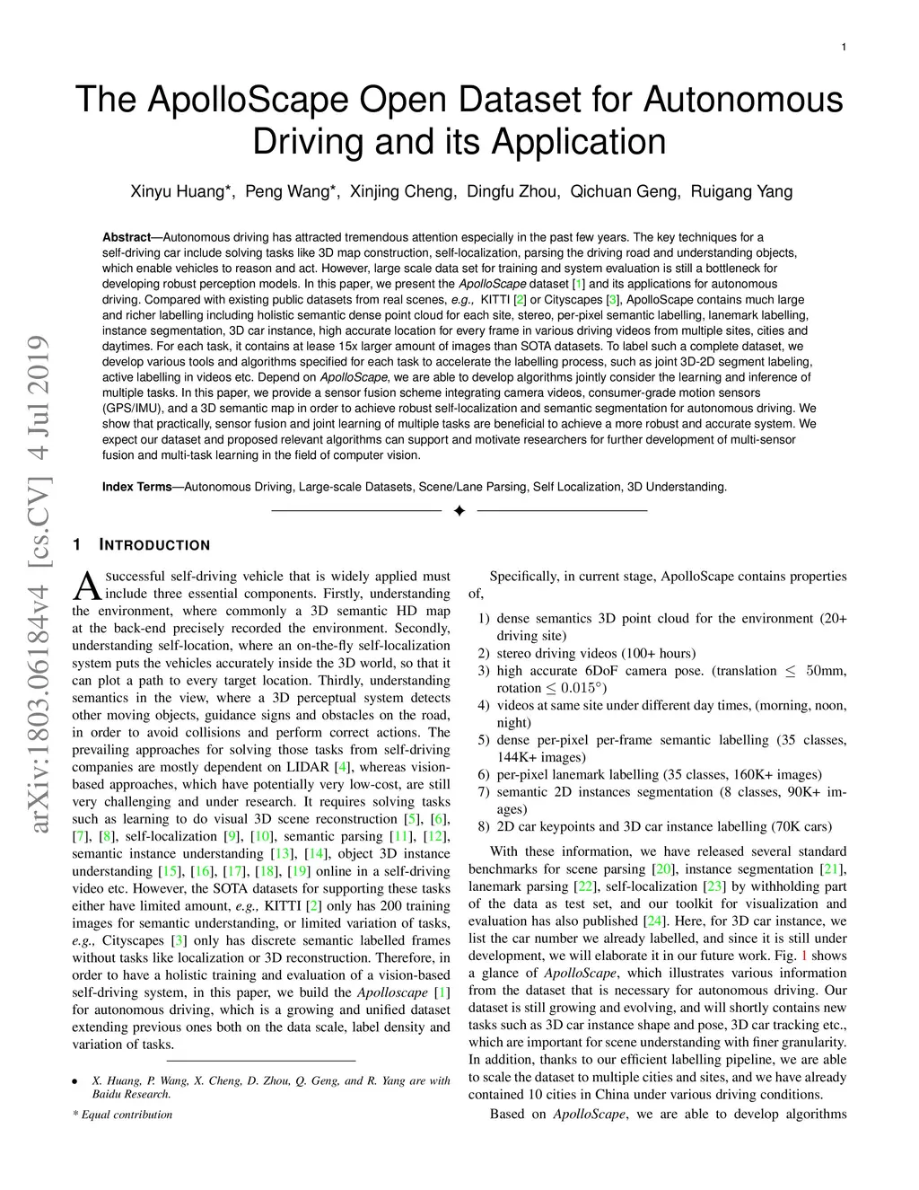 Autonomous driving has attracted tremendous attention especially in the past few years. The key techniques for a self-driving car include solving tasks like 3D map construction, self-localization, parsing the driving road and understanding objects, which enable vehicles to reason and act. However, large scale data set for training and system evaluation is still a bottleneck for developing robust perception models. In this paper, we present the ApolloScape dataset [1] and its applications for autonomous driving. Compared with existing public datasets from real scenes, e.g. KITTI [2] or Cityscapes [3], ApolloScape contains much large and richer labelling including holistic semantic dense point cloud for each site, stereo, per-pixel semantic labelling, lanemark labelling, instance segmentation, 3D car instance, high accurate location for every frame in various driving videos from multiple sites, cities and daytimes. For each task, it contains at lease 15x larger amount of images than SOTA datasets. To label such a complete dataset, we develop various tools and algorithms specified for each task to accelerate the labelling process, such as 3D-2D segment labeling tools, active labelling in videos etc. Depend on ApolloScape, we are able to develop algorithms jointly consider the learning and inference of multiple tasks. In this paper, we provide a sensor fusion scheme integrating camera videos, consumer-grade motion sensors (GPS/IMU), and a 3D semantic map in order to achieve robust self-localization and semantic segmentation for autonomous driving. We show that practically, sensor fusion and joint learning of multiple tasks are beneficial to achieve a more robust and accurate system. We expect our dataset and proposed relevant algorithms can support and motivate researchers for further development of multi-sensor fusion and multi-task learning in the field of computer vision.