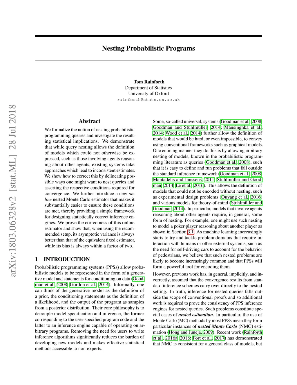 We formalize the notion of nesting probabilistic programming queries and investigate the resulting statistical implications. We demonstrate that while query nesting allows the definition of models which could not otherwise be expressed, such as those involving agents reasoning about other agents, existing systems take approaches which lead to inconsistent estimates. We show how to correct this by delineating possible ways one might want to nest queries and asserting the respective conditions required for convergence. We further introduce a new online nested Monte Carlo estimator that makes it substantially easier to ensure these conditions are met, thereby providing a simple framework for designing statistically correct inference engines. We prove the correctness of this online estimator and show that, when using the recommended setup, its asymptotic variance is always better than that of the equivalent fixed estimator, while its bias is always within a factor of two.