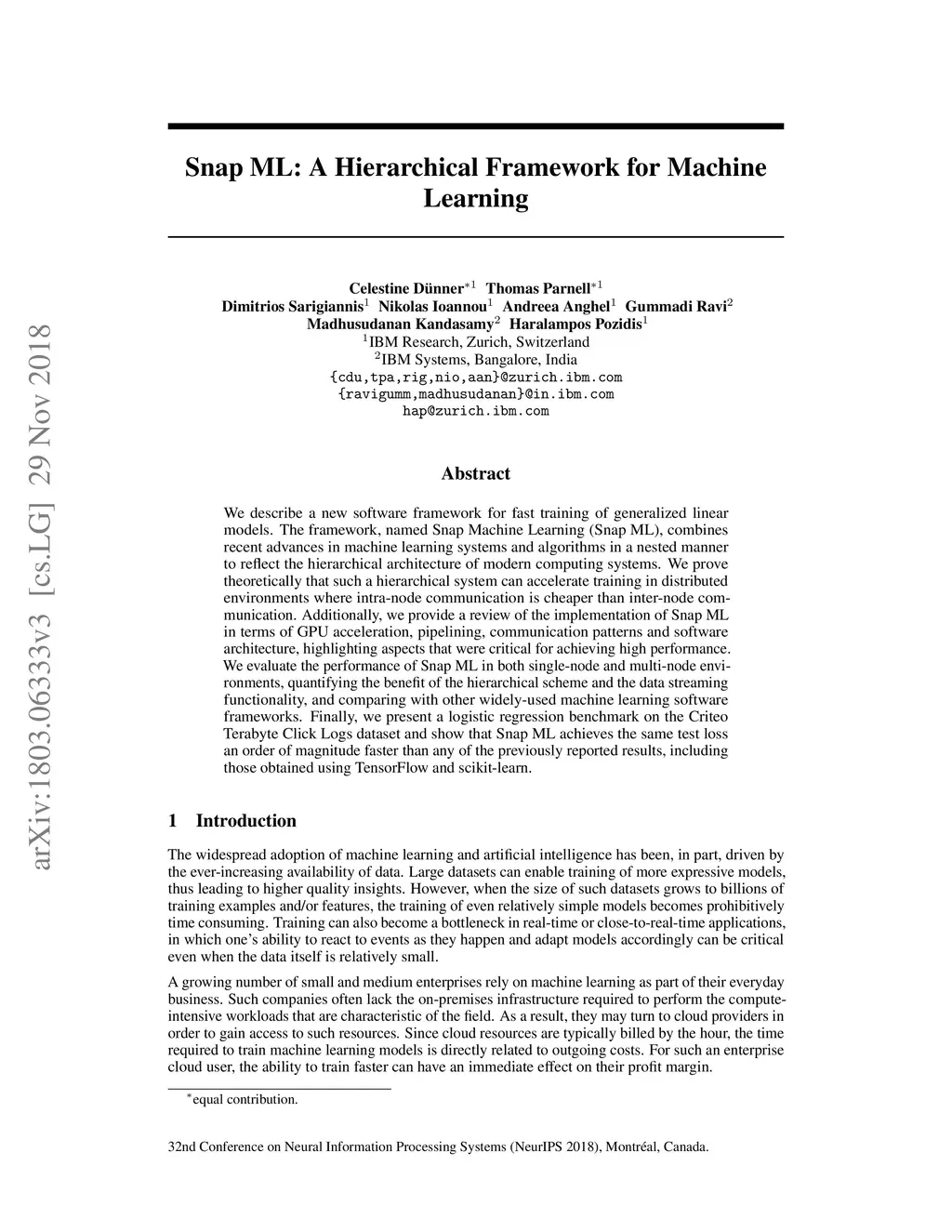 We describe a new software framework for fast training of generalized linear models. The framework, named Snap Machine Learning (Snap ML), combines recent advances in machine learning systems and algorithms in a nested manner to reflect the hierarchical architecture of modern computing systems. We prove theoretically that such a hierarchical system can accelerate training in distributed environments where intra-node communication is cheaper than inter-node communication. Additionally, we provide a review of the implementation of Snap ML in terms of GPU acceleration, pipelining, communication patterns and software architecture, highlighting aspects that were critical for achieving high performance. We evaluate the performance of Snap ML in both single-node and multi-node environments, quantifying the benefit of the hierarchical scheme and the data streaming functionality, and comparing with other widely-used machine learning software frameworks. Finally, we present a logistic regression benchmark on the Criteo Terabyte Click Logs dataset and show that Snap ML achieves the same test loss an order of magnitude faster than any of the previously reported results, including those obtained using TensorFlow and scikit-learn.