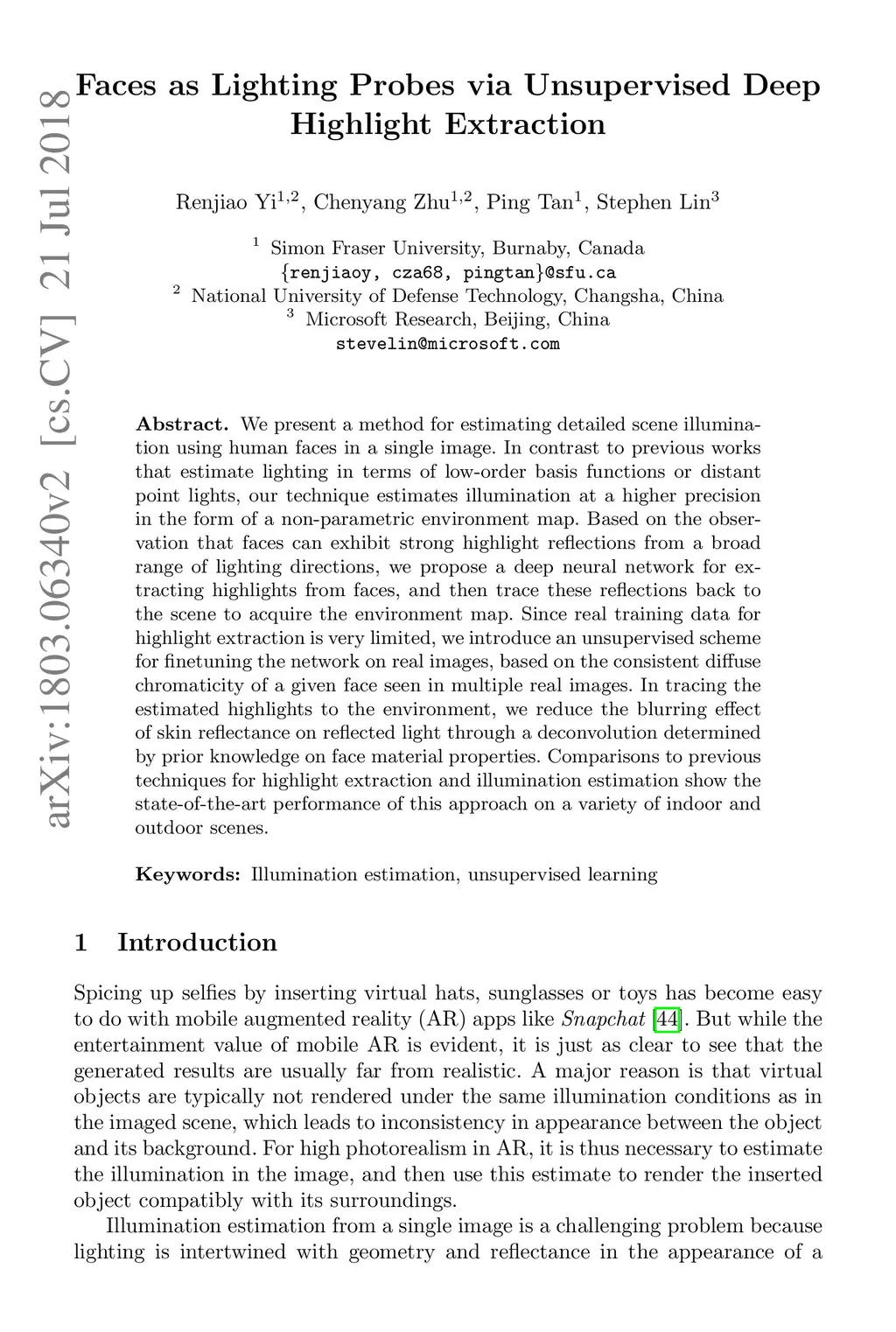 Faces as Lighting Probes via Unsupervised Deep Highlight Extraction