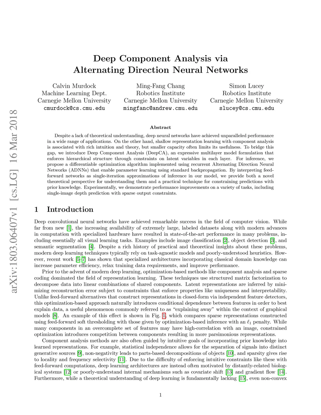 Despite a lack of theoretical understanding, deep neural networks have achieved unparalleled performance in a wide range of applications. On the other hand, shallow representation learning with component analysis is associated with rich intuition and theory, but smaller capacity often limits its usefulness. To bridge this gap, we introduce Deep Component Analysis (DeepCA), an expressive multilayer model formulation that enforces hierarchical structure through constraints on latent variables in each layer. For inference, we propose a differentiable optimization algorithm implemented using recurrent Alternating Direction Neural Networks (ADNNs) that enable parameter learning using standard backpropagation. By interpreting feed-forward networks as single-iteration approximations of inference in our model, we provide both a novel theoretical perspective for understanding them and a practical technique for constraining predictions with prior knowledge. Experimentally, we demonstrate performance improvements on a variety of tasks, including single-image depth prediction with sparse output constraints.