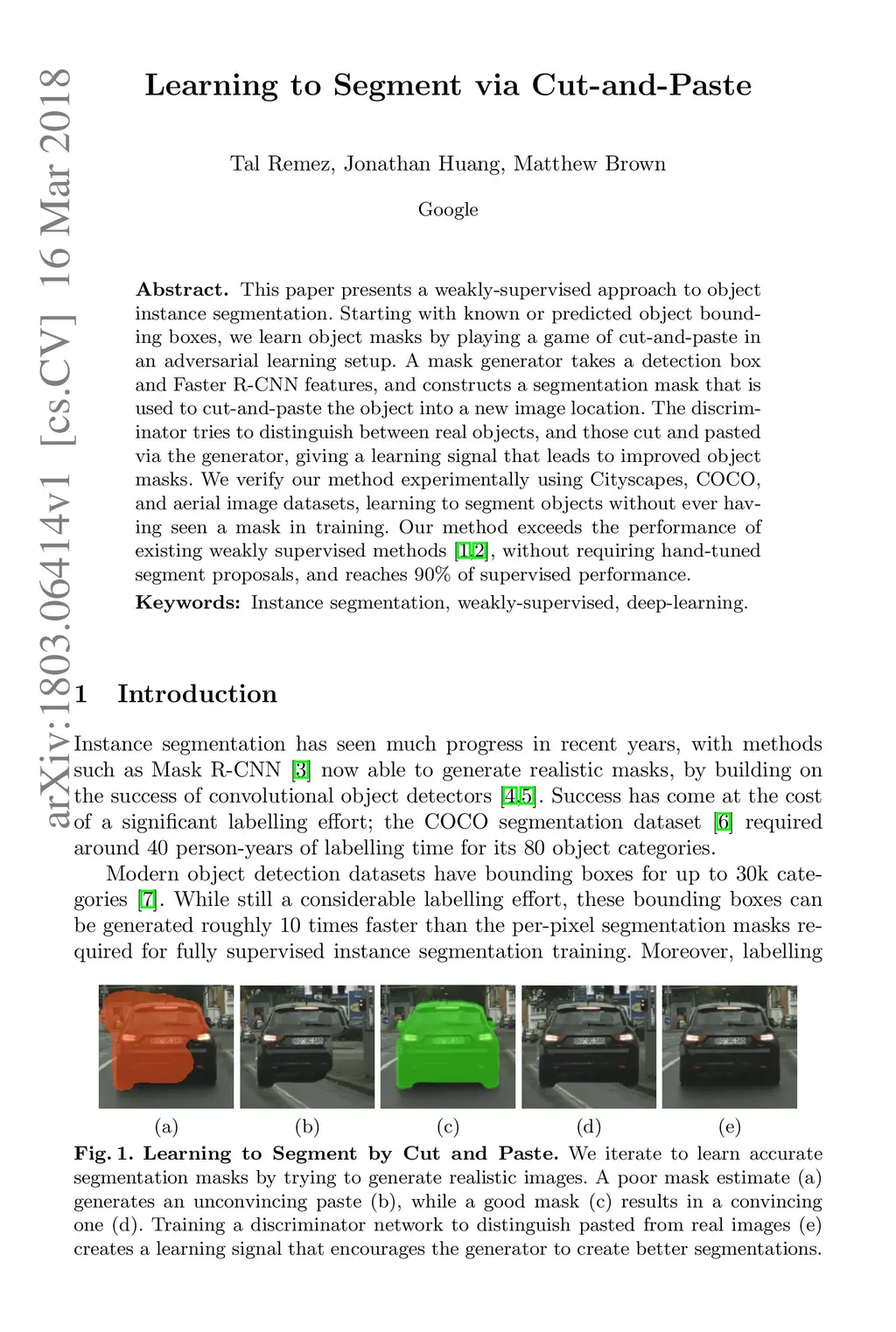 This paper presents a weakly-supervised approach to object instance segmentation. Starting with known or predicted object bounding boxes, we learn object masks by playing a game of cut-and-paste in an adversarial learning setup. A mask generator takes a detection box and Faster R-CNN features, and constructs a segmentation mask that is used to cut-and-paste the object into a new image location. The discriminator tries to distinguish between real objects, and those cut and pasted via the generator, giving a learning signal that leads to improved object masks. We verify our method experimentally using Cityscapes, COCO, and aerial image datasets, learning to segment objects without ever having seen a mask in training. Our method exceeds the performance of existing weakly supervised methods, without requiring hand-tuned segment proposals, and reaches 90% of supervised performance.