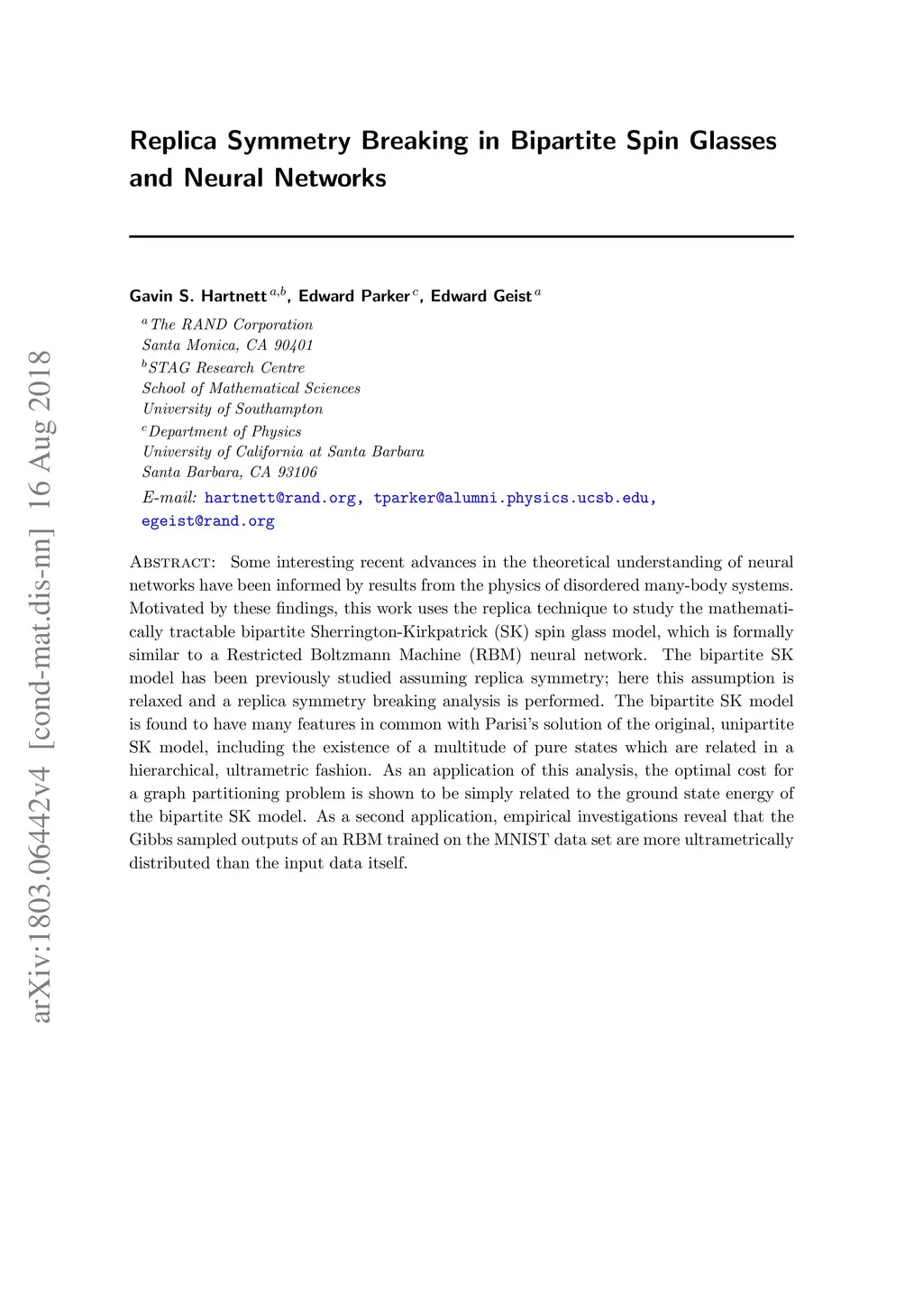 Some interesting recent advances in the theoretical understanding of neural networks have been informed by results from the physics of disordered many-body systems. Motivated by these findings, this work uses the replica technique to study the mathematically tractable bipartite Sherrington-Kirkpatrick (SK) spin glass model, which is formally similar to a Restricted Boltzmann Machine (RBM) neural network. The bipartite SK model has been previously studied assuming replica symmetry; here this assumption is relaxed and a replica symmetry breaking analysis is performed. The bipartite SK model is found to have many features in common with Parisi's solution of the original, unipartite SK model, including the existence of a multitude of pure states which are related in a hierarchical, ultrametric fashion. As an application of this analysis, the optimal cost for a graph partitioning problem is shown to be simply related to the ground state energy of the bipartite SK model. As a second application, empirical investigations reveal that the Gibbs sampled outputs of an RBM trained on the MNIST data set are more ultrametrically distributed than the input data itself.