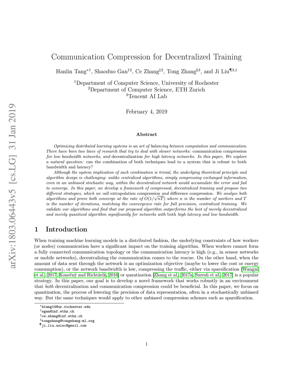 Optimizing distributed learning systems is an art of balancing between computation and communication. There have been two lines of research that try to deal with slower networks: {\em communication compression} for low bandwidth networks, and {\em decentralization} for high latency networks. In this paper, We explore a natural question: {\em can the combination of both techniques lead to a system that is robust to both bandwidth and latency?} Although the system implication of such combination is trivial, the underlying theoretical principle and algorithm design is challenging: unlike centralized algorithms, simply compressing exchanged information, even in an unbiased stochastic way, within the decentralized network would accumulate the error and fail to converge. In this paper, we develop a framework of compressed, decentralized training and propose two different strategies, which we call {\em extrapolation compression} and {\em difference compression}. We analyze both algorithms and prove both converge at the rate of where is the number of workers and is the number of iterations, matching the convergence rate for full precision, centralized training. We validate our algorithms and find that our proposed algorithm outperforms the best of merely decentralized and merely quantized algorithm significantly for networks with {\em both} high latency and low bandwidth.