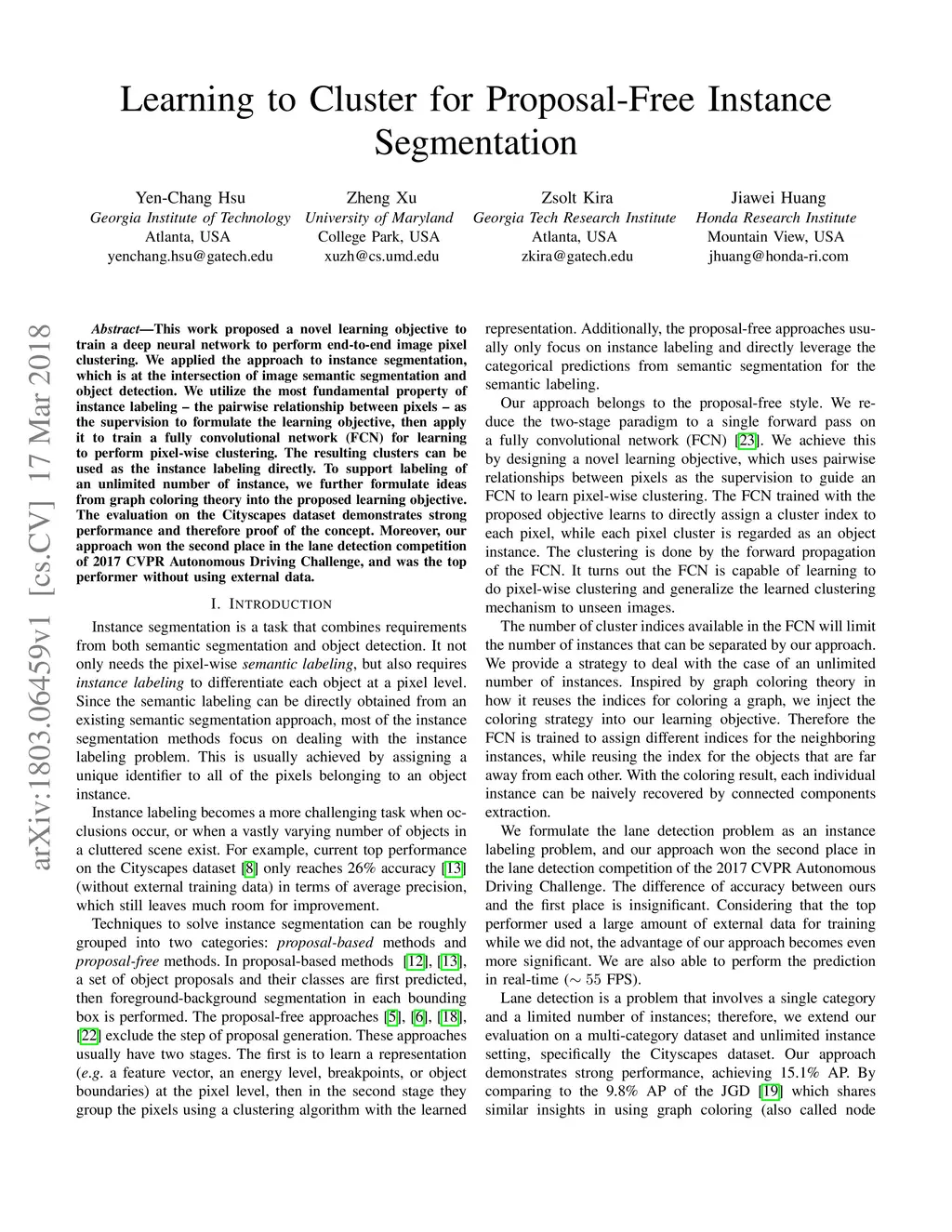 This work proposed a novel learning objective to train a deep neural network to perform end-to-end image pixel clustering. We applied the approach to instance segmentation, which is at the intersection of image semantic segmentation and object detection. We utilize the most fundamental property of instance labeling -- the pairwise relationship between pixels -- as the supervision to formulate the learning objective, then apply it to train a fully convolutional network (FCN) for learning to perform pixel-wise clustering. The resulting clusters can be used as the instance labeling directly. To support labeling of an unlimited number of instance, we further formulate ideas from graph coloring theory into the proposed learning objective. The evaluation on the Cityscapes dataset demonstrates strong performance and therefore proof of the concept. Moreover, our approach won the second place in the lane detection competition of 2017 CVPR Autonomous Driving Challenge, and was the top performer without using external data.