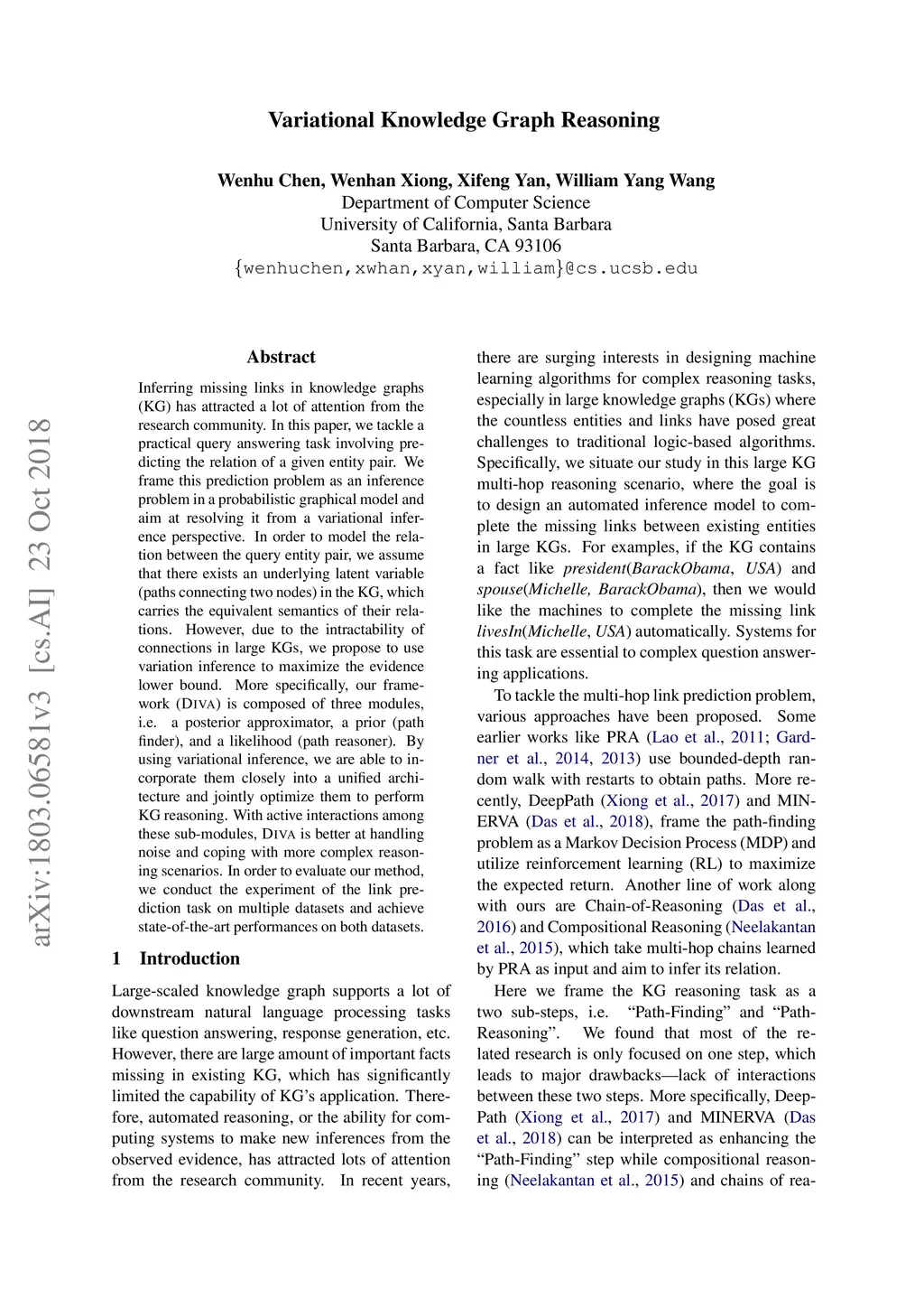 Inferring missing links in knowledge graphs (KG) has attracted a lot of attention from the research community. In this paper, we tackle a practical query answering task involving predicting the relation of a given entity pair. We frame this prediction problem as an inference problem in a probabilistic graphical model and aim at resolving it from a variational inference perspective. In order to model the relation between the query entity pair, we assume that there exists an underlying latent variable (paths connecting two nodes) in the KG, which carries the equivalent semantics of their relations. However, due to the intractability of connections in large KGs, we propose to use variation inference to maximize the evidence lower bound. More specifically, our framework (\textsc{Diva}) is composed of three modules, i.e. a posterior approximator, a prior (path finder), and a likelihood (path reasoner). By using variational inference, we are able to incorporate them closely into a unified architecture and jointly optimize them to perform KG reasoning. With active interactions among these sub-modules, \textsc{Diva} is better at handling noise and coping with more complex reasoning scenarios. In order to evaluate our method, we conduct the experiment of the link prediction task on multiple datasets and achieve state-of-the-art performances on both datasets.