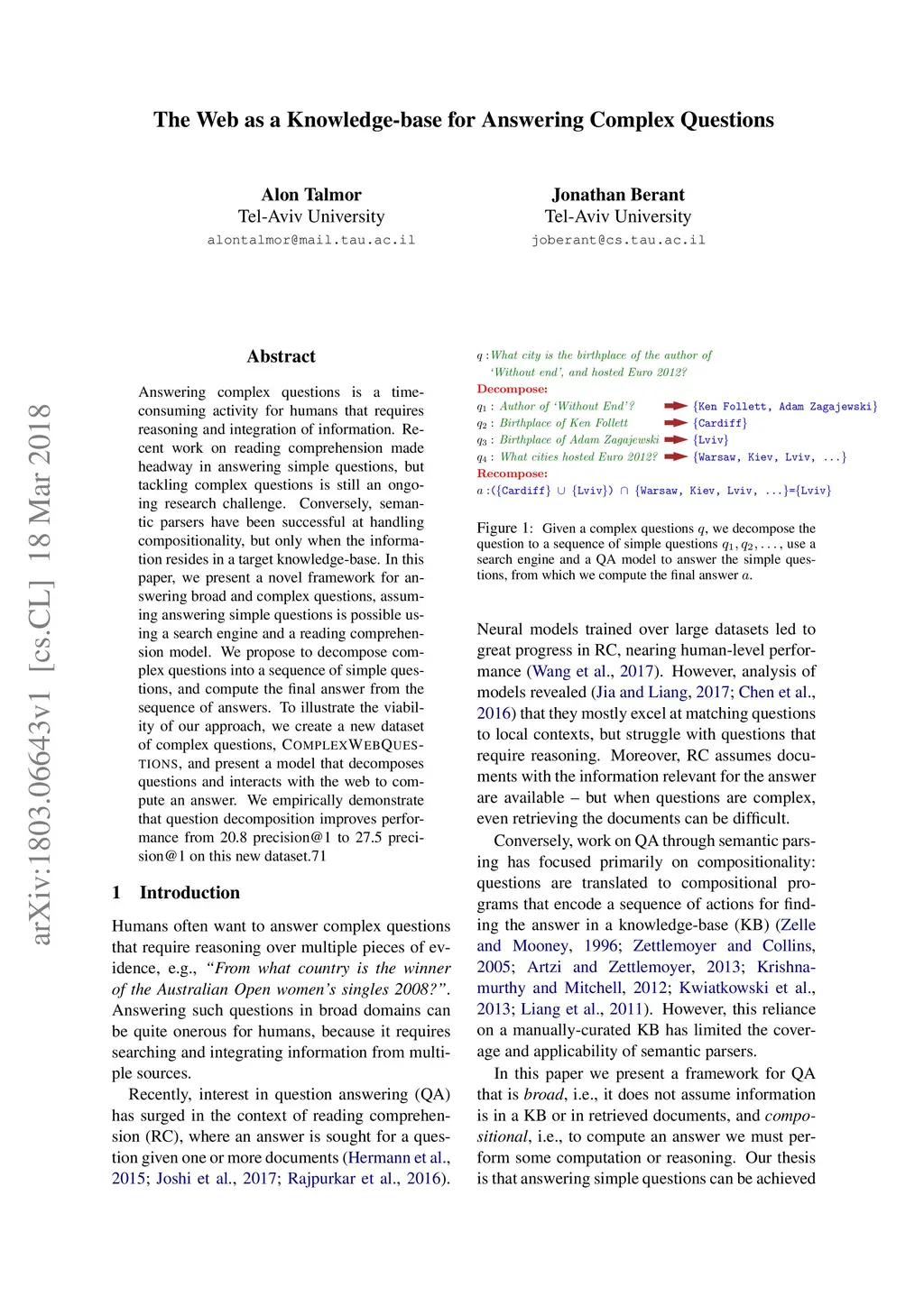 The Web as a Knowledge-base for Answering Complex Questions