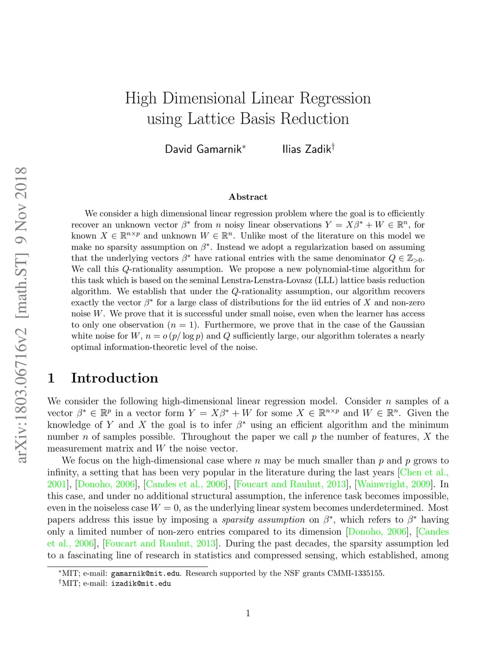 We consider a high dimensional linear regression problem where the goal is to efficiently recover an unknown vector from noisy linear observations , for known and unknown . Unlike most of the literature on this model we make no sparsity assumption on . Instead we adopt a regularization based on assuming that the underlying vectors have rational entries with the same denominator . We call this -rationality assumption. We propose a new polynomial-time algorithm for this task which is based on the seminal Lenstra-Lenstra-Lovasz (LLL) lattice basis reduction algorithm. We establish that under the -rationality assumption, our algorithm recovers exactly the vector for a large class of distributions for the iid entries of and non-zero noise . We prove that it is successful under small noise, even when the learner has access to only one observation (). Furthermore, we prove that in the case of the Gaussian white noise for , and sufficiently large, our algorithm tolerates a nearly optimal information-theoretic level of the noise.
