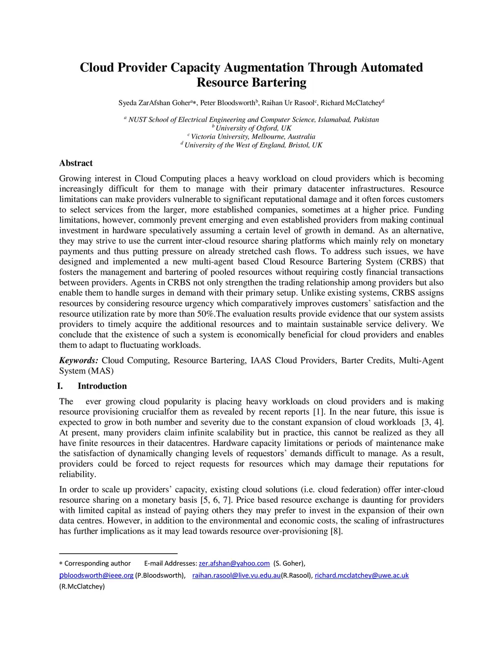 Growing interest in Cloud Computing places a heavy workload on cloud providers which is becoming increasingly difficult for them to manage with their primary datacenter infrastructures. Resource limitations can make providers vulnerable to significant reputational damage and it often forces customers to select services from the larger, more established companies, sometimes at a higher price. Funding limitations, however, commonly prevent emerging and even established providers from making continual investment in hardware speculatively assuming a certain level of growth in demand. As an alternative, they may strive to use the current inter-cloud resource sharing platforms which mainly rely on monetary payments and thus putting pressure on already stretched cash flows. To address such issues, we have designed and implemented a new multi-agent based Cloud Resource Bartering System (CRBS) that fosters the management and bartering of pooled resources without requiring costly financial transactions between providers. Agents in CRBS not only strengthen the trading relationship among providers but also enable them to handle surges in demand with their primary setup. Unlike existing systems, CRBS assigns resources by considering resource urgency which comparatively improves customers satisfaction and the resource utilization rate by more than 50%.The evaluation results provide evidence that our system assists providers to timely acquire the additional resources and to maintain sustainable service delivery. We conclude that the existence of such a system is economically beneficial for cloud providers and enables them to adapt to fluctuating workloads.