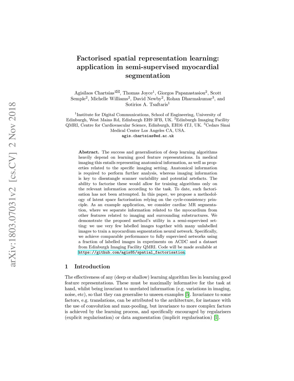The success and generalisation of deep learning algorithms heavily depend on learning good feature representations. In medical imaging this entails representing anatomical information, as well as properties related to the specific imaging setting. Anatomical information is required to perform further analysis, whereas imaging information is key to disentangle scanner variability and potential artefacts. The ability to factorise these would allow for training algorithms only on the relevant information according to the task. To date, such factorisation has not been attempted. In this paper, we propose a methodology of latent space factorisation relying on the cycle-consistency principle. As an example application, we consider cardiac MR segmentation, where we separate information related to the myocardium from other features related to imaging and surrounding substructures. We demonstrate the proposed method's utility in a semi-supervised setting: we use very few labelled images together with many unlabelled images to train a myocardium segmentation neural network. Specifically, we achieve comparable performance to fully supervised networks using a fraction of labelled images in experiments on ACDC and a dataset from Edinburgh Imaging Facility QMRI. Code will be made available at https://github.com/agis85/spatial_factorisation.