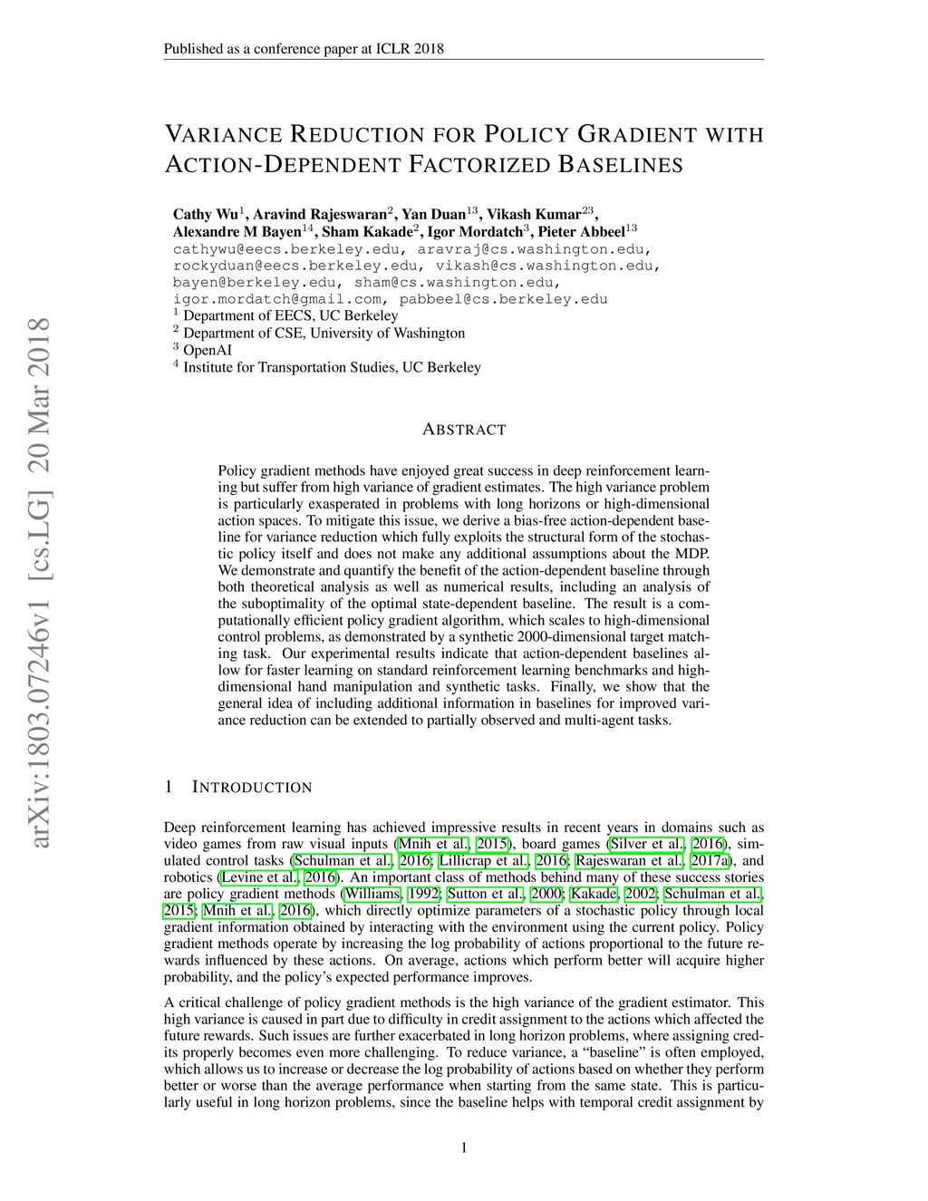 Policy gradient methods have enjoyed great success in deep reinforcement learning but suffer from high variance of gradient estimates. The high variance problem is particularly exasperated in problems with long horizons or high-dimensional action spaces. To mitigate this issue, we derive a bias-free action-dependent baseline for variance reduction which fully exploits the structural form of the stochastic policy itself and does not make any additional assumptions about the MDP. We demonstrate and quantify the benefit of the action-dependent baseline through both theoretical analysis as well as numerical results, including an analysis of the suboptimality of the optimal state-dependent baseline. The result is a computationally efficient policy gradient algorithm, which scales to high-dimensional control problems, as demonstrated by a synthetic 2000-dimensional target matching task. Our experimental results indicate that action-dependent baselines allow for faster learning on standard reinforcement learning benchmarks and high-dimensional hand manipulation and synthetic tasks. Finally, we show that the general idea of including additional information in baselines for improved variance reduction can be extended to partially observed and multi-agent tasks.