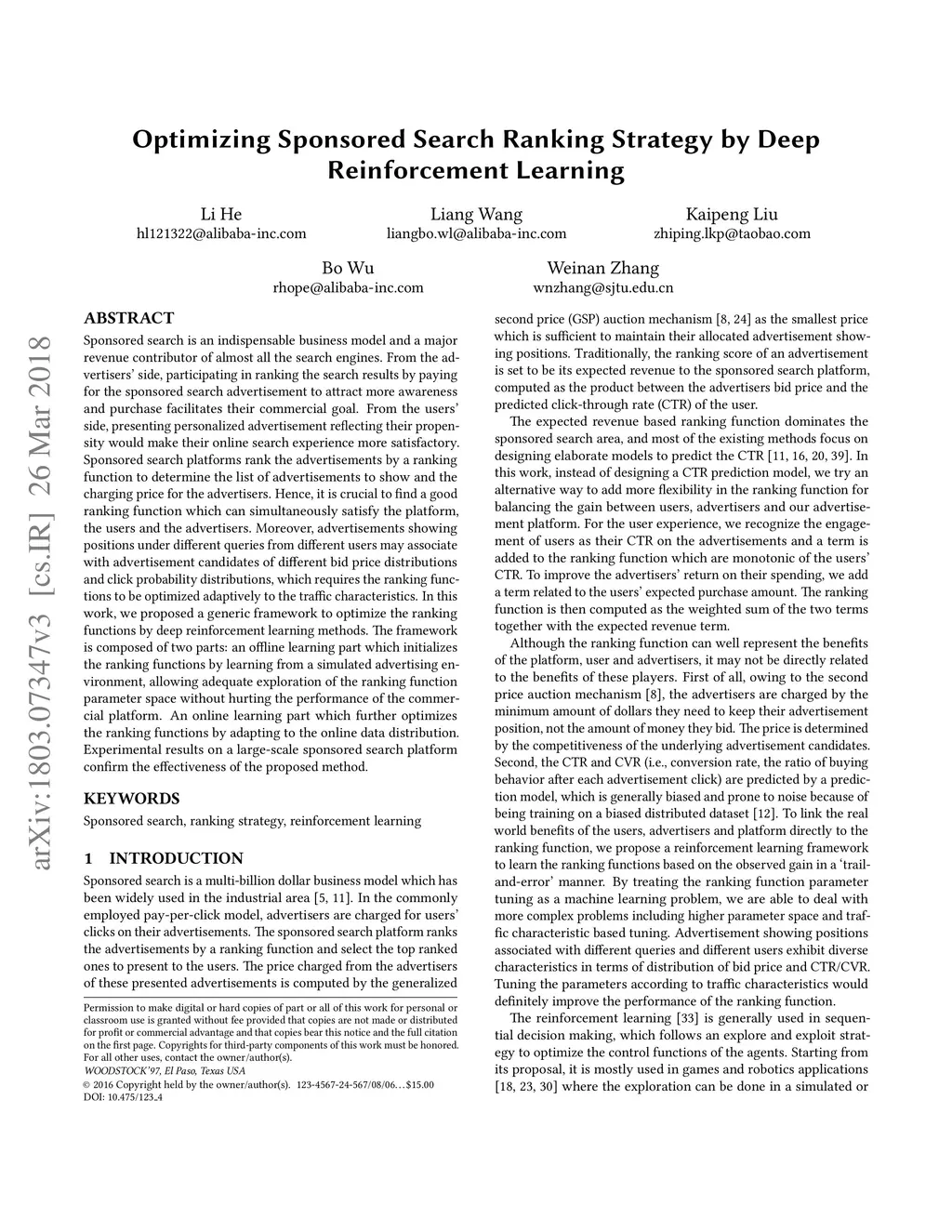 Sponsored search is an indispensable business model and a major revenue contributor of almost all the search engines. From the advertisers' side, participating in ranking the search results by paying for the sponsored search advertisement to attract more awareness and purchase facilitates their commercial goal. From the users' side, presenting personalized advertisement reflecting their propensity would make their online search experience more satisfactory. Sponsored search platforms rank the advertisements by a ranking function to determine the list of advertisements to show and the charging price for the advertisers. Hence, it is crucial to find a good ranking function which can simultaneously satisfy the platform, the users and the advertisers. Moreover, advertisements showing positions under different queries from different users may associate with advertisement candidates of different bid price distributions and click probability distributions, which requires the ranking functions to be optimized adaptively to the traffic characteristics. In this work, we proposed a generic framework to optimize the ranking functions by deep reinforcement learning methods. The framework is composed of two parts: an offline learning part which initializes the ranking functions by learning from a simulated advertising environment, allowing adequate exploration of the ranking function parameter space without hurting the performance of the commercial platform. An online learning part which further optimizes the ranking functions by adapting to the online data distribution. Experimental results on a large-scale sponsored search platform confirm the effectiveness of the proposed method.