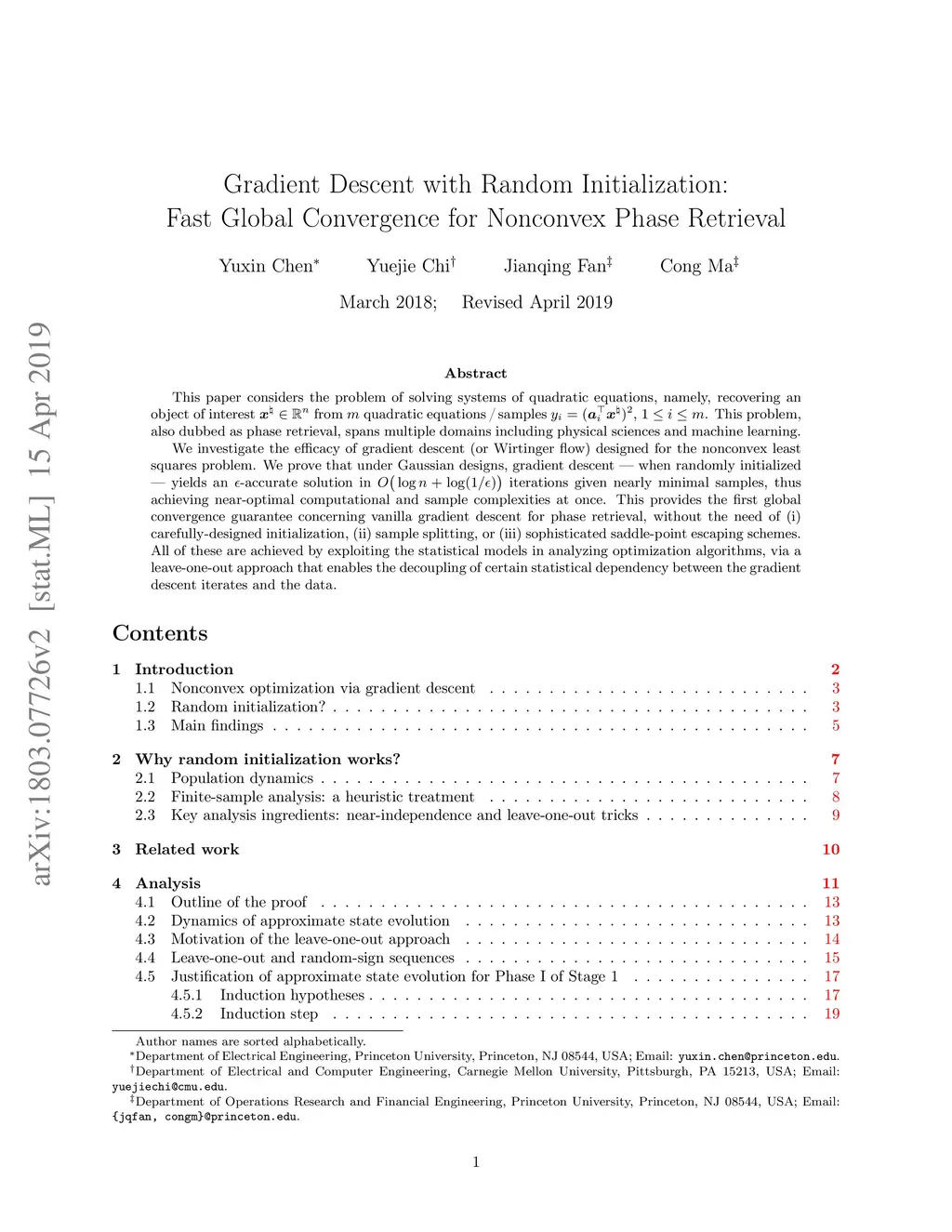 This paper considers the problem of solving systems of quadratic equations, namely, recovering an object of interest from quadratic equations/samples , . This problem, also dubbed as phase retrieval, spans multiple domains including physical sciences and machine learning. We investigate the efficiency of gradient descent (or Wirtinger flow) designed for the nonconvex least squares problem. We prove that under Gaussian designs, gradient descent --- when randomly initialized --- yields an -accurate solution in iterations given nearly minimal samples, thus achieving near-optimal computational and sample complexities at once. This provides the first global convergence guarantee concerning vanilla gradient descent for phase retrieval, without the need of (i) carefully-designed initialization, (ii) sample splitting, or (iii) sophisticated saddle-point escaping schemes. All of these are achieved by exploiting the statistical models in analyzing optimization algorithms, via a leave-one-out approach that enables the decoupling of certain statistical dependency between the gradient descent iterates and the data.