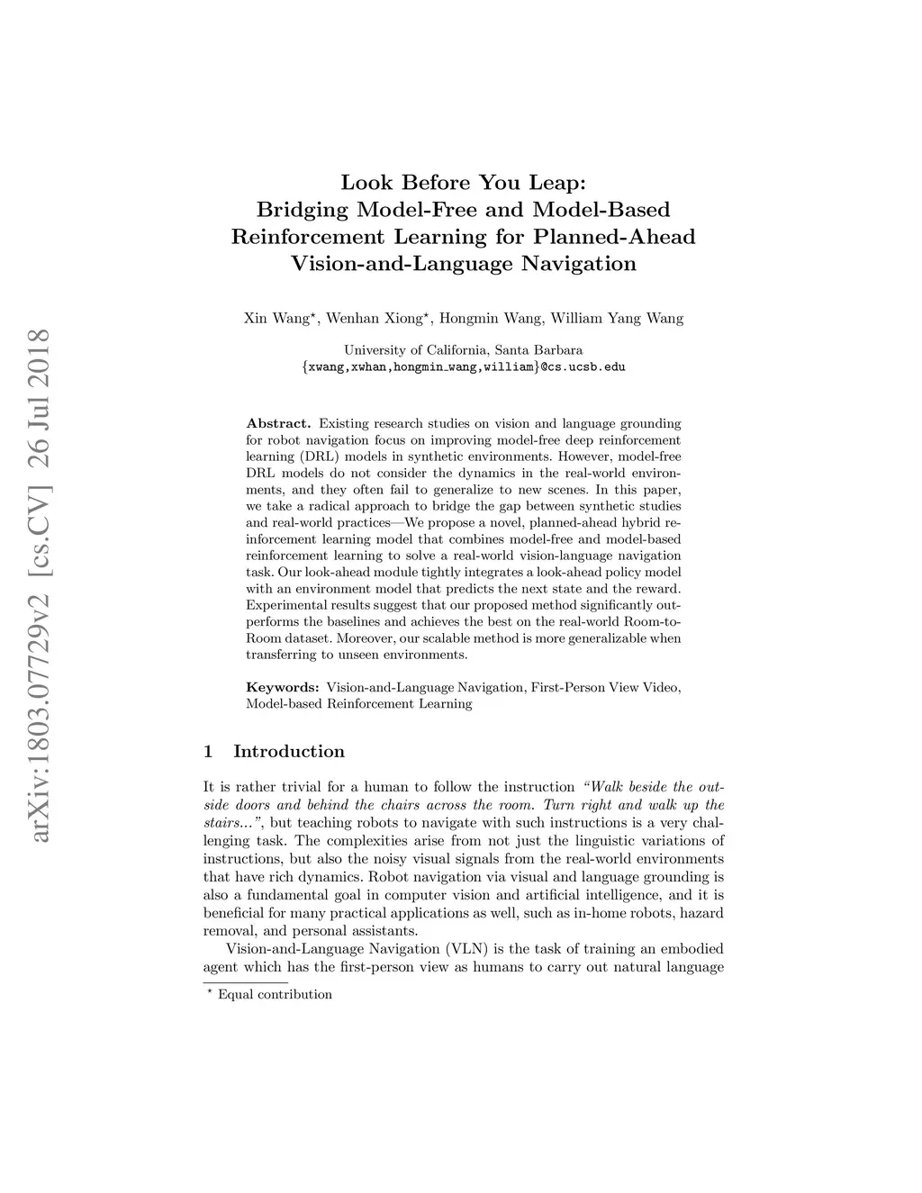 Existing research studies on vision and language grounding for robot navigation focus on improving model-free deep reinforcement learning (DRL) models in synthetic environments. However, model-free DRL models do not consider the dynamics in the real-world environments, and they often fail to generalize to new scenes. In this paper, we take a radical approach to bridge the gap between synthetic studies and real-world practices---We propose a novel, planned-ahead hybrid reinforcement learning model that combines model-free and model-based reinforcement learning to solve a real-world vision-language navigation task. Our look-ahead module tightly integrates a look-ahead policy model with an environment model that predicts the next state and the reward. Experimental results suggest that our proposed method significantly outperforms the baselines and achieves the best on the real-world Room-to-Room dataset. Moreover, our scalable method is more generalizable when transferring to unseen environments.