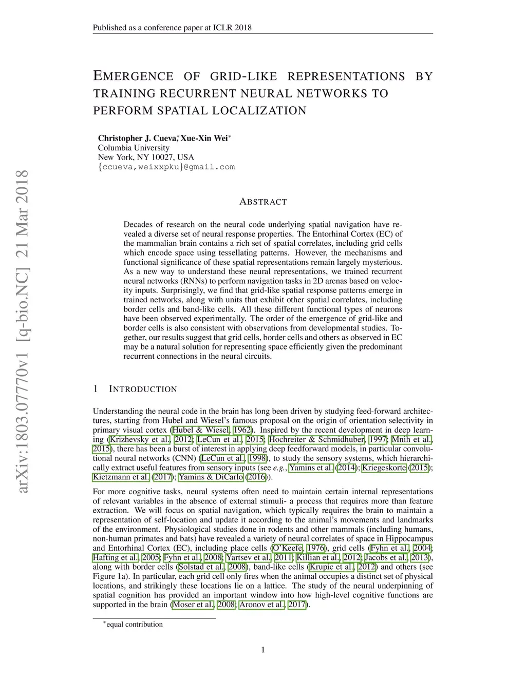 Decades of research on the neural code underlying spatial navigation have revealed a diverse set of neural response properties. The Entorhinal Cortex (EC) of the mammalian brain contains a rich set of spatial correlates, including grid cells which encode space using tessellating patterns. However, the mechanisms and functional significance of these spatial representations remain largely mysterious. As a new way to understand these neural representations, we trained recurrent neural networks (RNNs) to perform navigation tasks in 2D arenas based on velocity inputs. Surprisingly, we find that grid-like spatial response patterns emerge in trained networks, along with units that exhibit other spatial correlates, including border cells and band-like cells. All these different functional types of neurons have been observed experimentally. The order of the emergence of grid-like and border cells is also consistent with observations from developmental studies. Together, our results suggest that grid cells, border cells and others as observed in EC may be a natural solution for representing space efficiently given the predominant recurrent connections in the neural circuits.