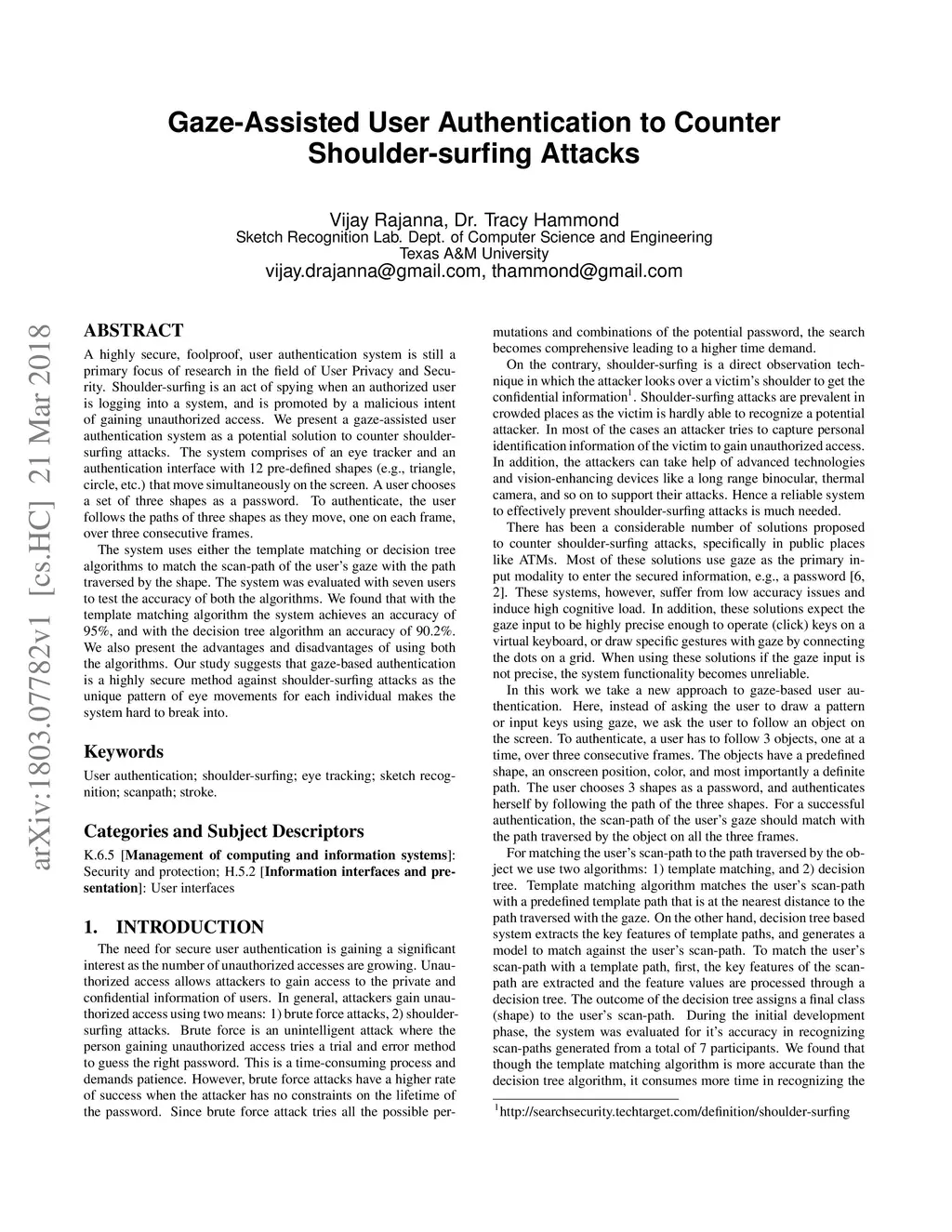A highly secure, foolproof, user authentication system is still a primary focus of research in the field of User Privacy and Security. Shoulder-surfing is an act of spying when an authorized user is logging into a system, and is promoted by a malicious intent of gaining unauthorized access. We present a gaze-assisted user authentication system as a potential solution to counter shoulder-surfing attacks. The system comprises of an eye tracker and an authentication interface with 12 pre-defined shapes (e.g., triangle, circle, etc.) that move simultaneously on the screen. A user chooses a set of three shapes as a password. To authenticate, the user follows the paths of three shapes as they move, one on each frame, over three consecutive frames. The system uses either the template matching or decision tree algorithms to match the scan-path of the user's gaze with the path traversed by the shape. The system was evaluated with seven users to test the accuracy of both the algorithms. We found that with the template matching algorithm the system achieves an accuracy of 95%, and with the decision tree algorithm an accuracy of 90.2%. We also present the advantages and disadvantages of using both the algorithms. Our study suggests that gaze-based authentication is a highly secure method against shoulder-surfing attacks as the unique pattern of eye movements for each individual makes the system hard to break into.