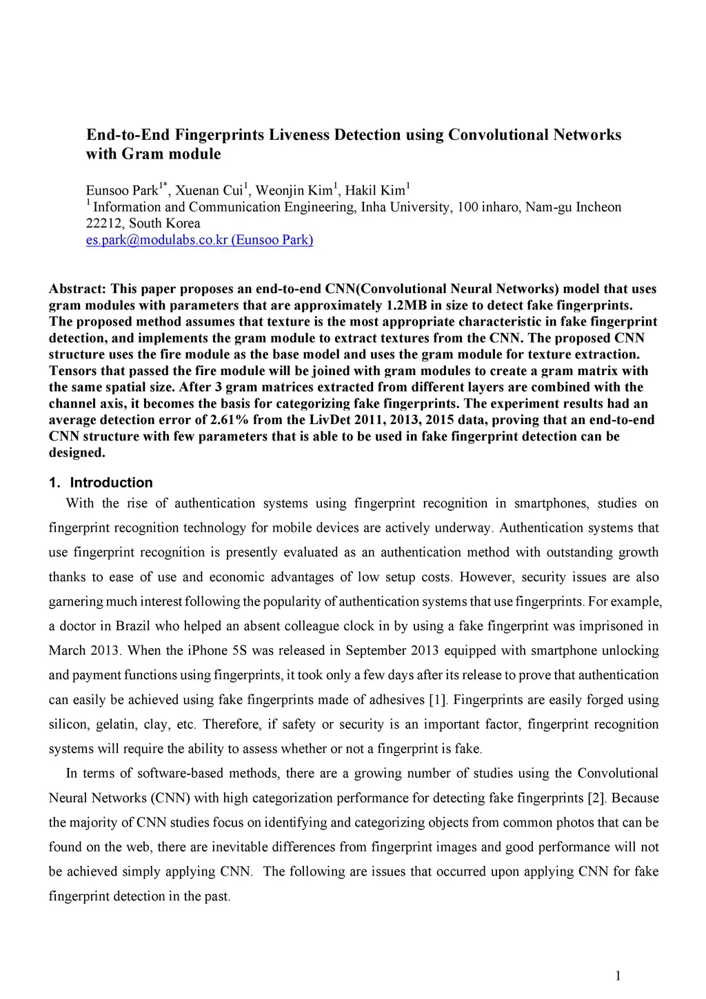 This paper proposes an end-to-end CNN(Convolutional Neural Networks) model that uses gram modules with parameters that are approximately 1.2MB in size to detect fake fingerprints. The proposed method assumes that texture is the most appropriate characteristic in fake fingerprint detection, and implements the gram module to extract textures from the CNN. The proposed CNN structure uses the fire module as the base model and uses the gram module for texture extraction. Tensors that passed the fire module will be joined with gram modules to create a gram matrix with the same spatial size. After 3 gram matrices extracted from different layers are combined with the channel axis, it becomes the basis for categorizing fake fingerprints. The experiment results had an average detection error of 2.61% from the LivDet 2011, 2013, 2015 data, proving that an end-to-end CNN structure with few parameters that is able to be used in fake fingerprint detection can be designed.