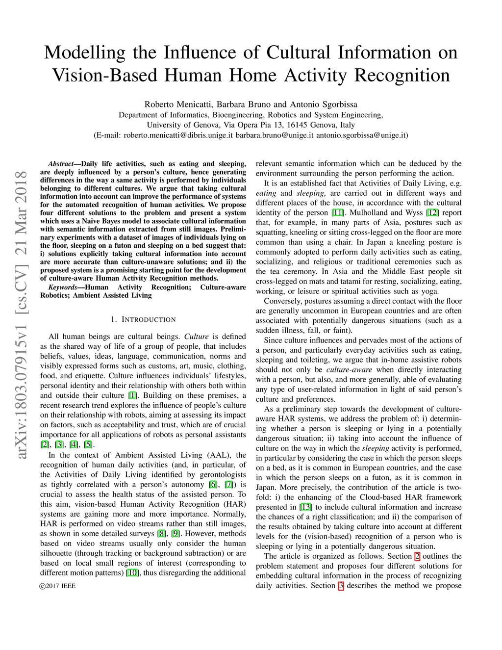 Daily life activities, such as eating and sleeping, are deeply influenced by a person's culture, hence generating differences in the way a same activity is performed by individuals belonging to different cultures. We argue that taking cultural information into account can improve the performance of systems for the automated recognition of human activities. We propose four different solutions to the problem and present a system which uses a Naive Bayes model to associate cultural information with semantic information extracted from still images. Preliminary experiments with a dataset of images of individuals lying on the floor, sleeping on a futon and sleeping on a bed suggest that: i) solutions explicitly taking cultural information into account are more accurate than culture-unaware solutions; and ii) the proposed system is a promising starting point for the development of culture-aware Human Activity Recognition methods.