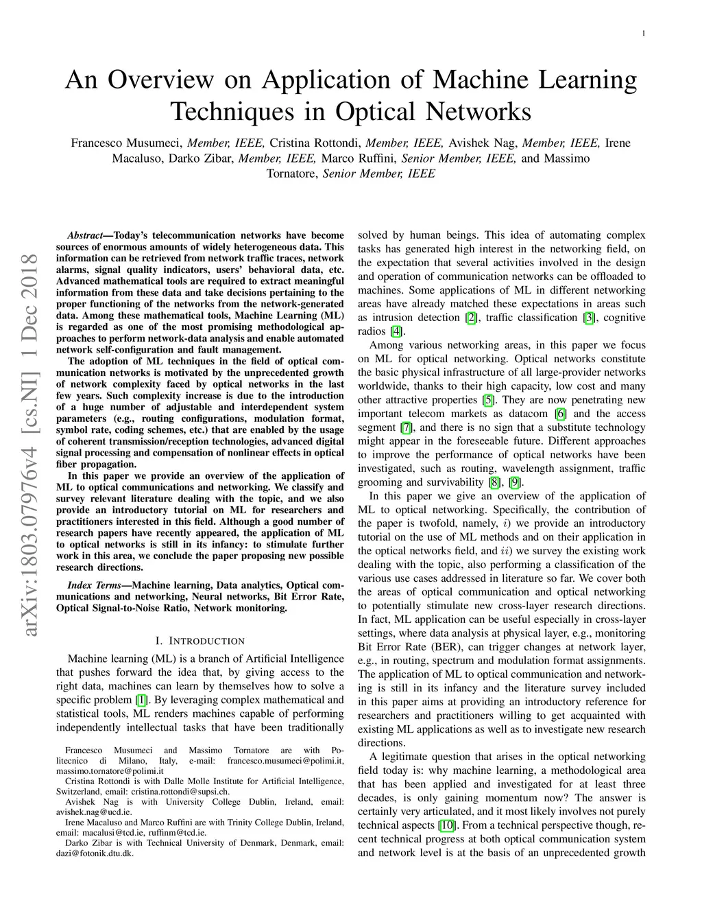 Today's telecommunication networks have become sources of enormous amounts of widely heterogeneous data. This information can be retrieved from network traffic traces, network alarms, signal quality indicators, users' behavioral data, etc. Advanced mathematical tools are required to extract meaningful information from these data and take decisions pertaining to the proper functioning of the networks from the network-generated data. Among these mathematical tools, Machine Learning (ML) is regarded as one of the most promising methodological approaches to perform network-data analysis and enable automated network self-configuration and fault management. The adoption of ML techniques in the field of optical communication networks is motivated by the unprecedented growth of network complexity faced by optical networks in the last few years. Such complexity increase is due to the introduction of a huge number of adjustable and interdependent system parameters (e.g., routing configurations, modulation format, symbol rate, coding schemes, etc.) that are enabled by the usage of coherent transmission/reception technologies, advanced digital signal processing and compensation of nonlinear effects in optical fiber propagation. In this paper we provide an overview of the application of ML to optical communications and networking. We classify and survey relevant literature dealing with the topic, and we also provide an introductory tutorial on ML for researchers and practitioners interested in this field. Although a good number of research papers have recently appeared, the application of ML to optical networks is still in its infancy: to stimulate further work in this area, we conclude the paper proposing new possible research directions.