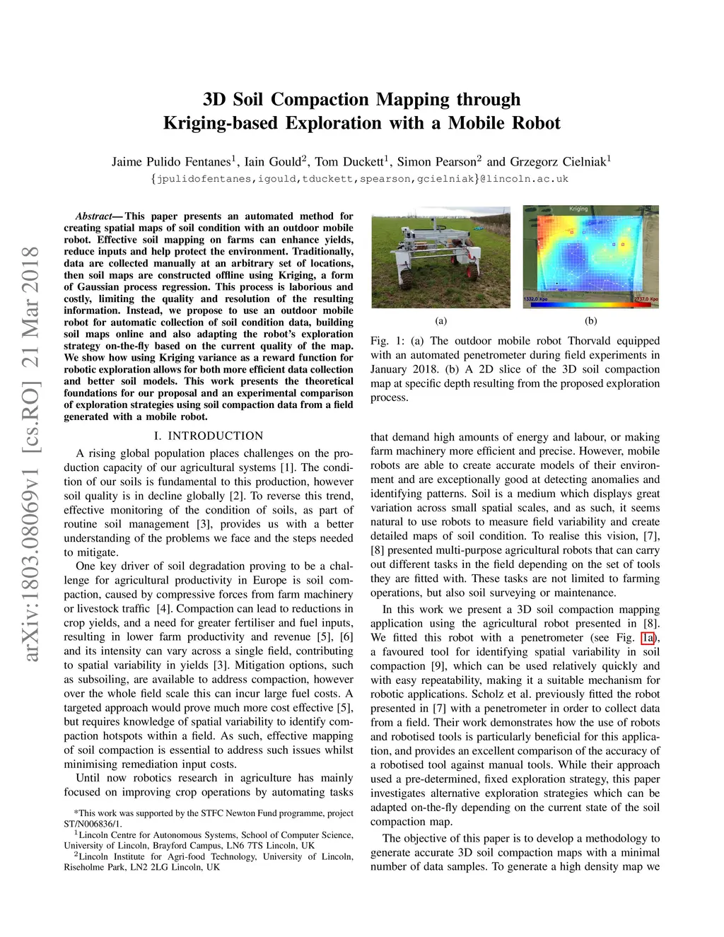 This paper presents an automated method for creating spatial maps of soil condition with an outdoor mobile robot. Effective soil mapping on farms can enhance yields, reduce inputs and help protect the environment. Traditionally, data are collected manually at an arbitrary set of locations, then soil maps are constructed offline using Kriging, a form of Gaussian process regression. This process is laborious and costly, limiting the quality and resolution of the resulting information. Instead, we propose to use an outdoor mobile robot for automatic collection of soil condition data, building soil maps online and also adapting the robot's exploration strategy on-the-fly based on the current quality of the map. We show how using Kriging variance as a reward function for robotic exploration allows for both more efficient data collection and better soil models. This work presents the theoretical foundations for our proposal and an experimental comparison of exploration strategies using soil compaction data from a field generated with a mobile robot.