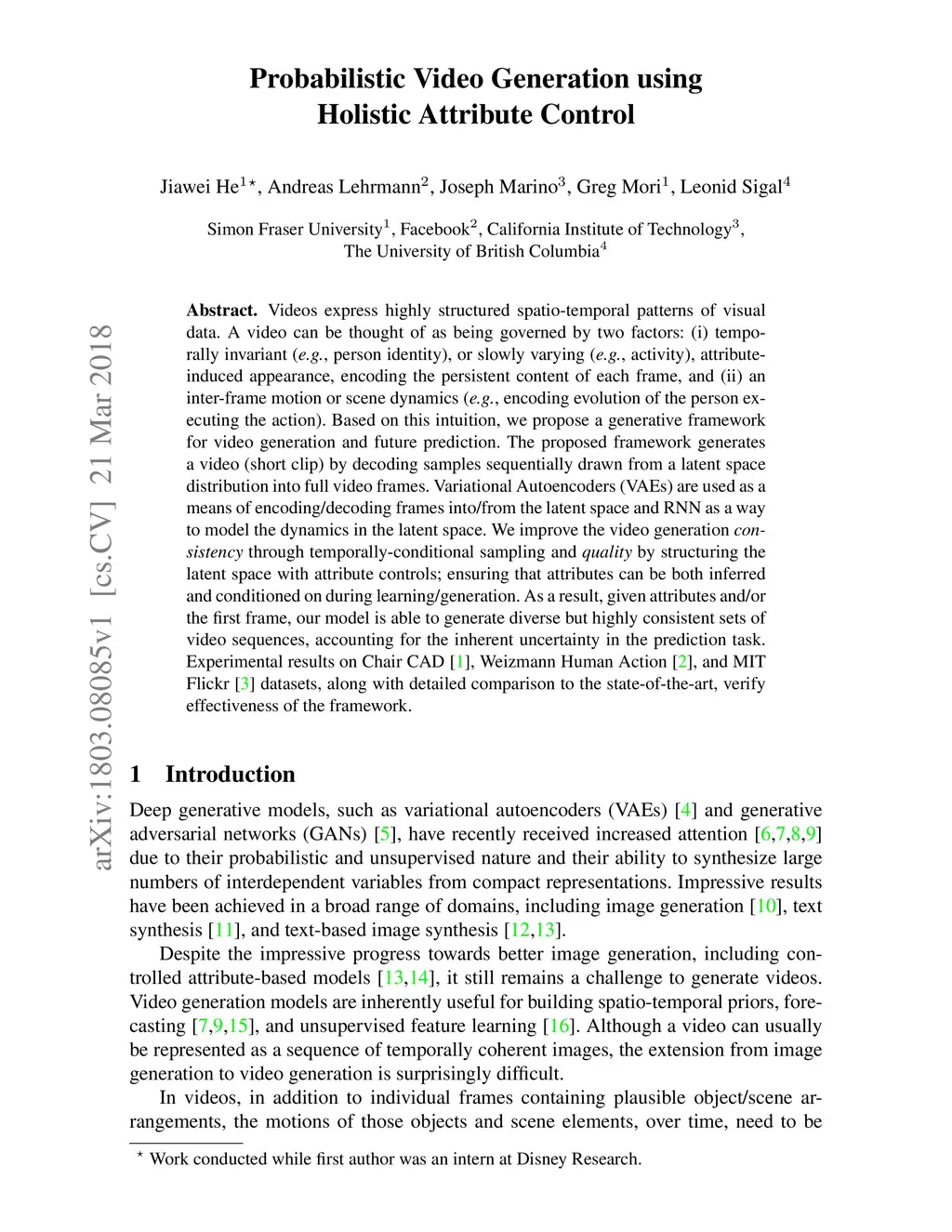 Videos express highly structured spatio-temporal patterns of visual data. A video can be thought of as being governed by two factors: (i) temporally invariant (e.g., person identity), or slowly varying (e.g., activity), attribute-induced appearance, encoding the persistent content of each frame, and (ii) an inter-frame motion or scene dynamics (e.g., encoding evolution of the person ex-ecuting the action). Based on this intuition, we propose a generative framework for video generation and future prediction. The proposed framework generates a video (short clip) by decoding samples sequentially drawn from a latent space distribution into full video frames. Variational Autoencoders (VAEs) are used as a means of encoding/decoding frames into/from the latent space and RNN as a wayto model the dynamics in the latent space. We improve the video generation consistency through temporally-conditional sampling and quality by structuring the latent space with attribute controls; ensuring that attributes can be both inferred and conditioned on during learning/generation. As a result, given attributes and/orthe first frame, our model is able to generate diverse but highly consistent sets ofvideo sequences, accounting for the inherent uncertainty in the prediction task. Experimental results on Chair CAD, Weizmann Human Action, and MIT-Flickr datasets, along with detailed comparison to the state-of-the-art, verify effectiveness of the framework.