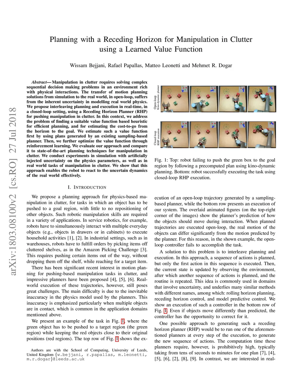 Manipulation in clutter requires solving complex sequential decision making problems in an environment rich with physical interactions. The transfer of motion planning solutions from simulation to the real world, in open-loop, suffers from the inherent uncertainty in modelling real world physics. We propose interleaving planning and execution in real-time, in a closed-loop setting, using a Receding Horizon Planner (RHP) for pushing manipulation in clutter. In this context, we address the problem of finding a suitable value function based heuristic for efficient planning, and for estimating the cost-to-go from the horizon to the goal. We estimate such a value function first by using plans generated by an existing sampling-based planner. Then, we further optimize the value function through reinforcement learning. We evaluate our approach and compare it to state-of-the-art planning techniques for manipulation in clutter. We conduct experiments in simulation with artificially injected uncertainty on the physics parameters, as well as in real world tasks of manipulation in clutter. We show that this approach enables the robot to react to the uncertain dynamics of the real world effectively.