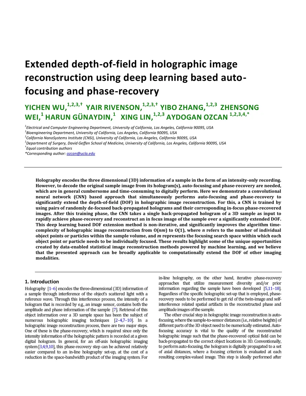 Holography encodes the three dimensional (3D) information of a sample in the form of an intensity-only recording. However, to decode the original sample image from its hologram(s), auto-focusing and phase-recovery are needed, which are in general cumbersome and time-consuming to digitally perform. Here we demonstrate a convolutional neural network (CNN) based approach that simultaneously performs auto-focusing and phase-recovery to significantly extend the depth-of-field (DOF) in holographic image reconstruction. For this, a CNN is trained by using pairs of randomly de-focused back-propagated holograms and their corresponding in-focus phase-recovered images. After this training phase, the CNN takes a single back-propagated hologram of a 3D sample as input to rapidly achieve phase-recovery and reconstruct an in focus image of the sample over a significantly extended DOF. This deep learning based DOF extension method is non-iterative, and significantly improves the algorithm time-complexity of holographic image reconstruction from O(nm) to O(1), where n refers to the number of individual object points or particles within the sample volume, and m represents the focusing search space within which each object point or particle needs to be individually focused. These results highlight some of the unique opportunities created by data-enabled statistical image reconstruction methods powered by machine learning, and we believe that the presented approach can be broadly applicable to computationally extend the DOF of other imaging modalities.
