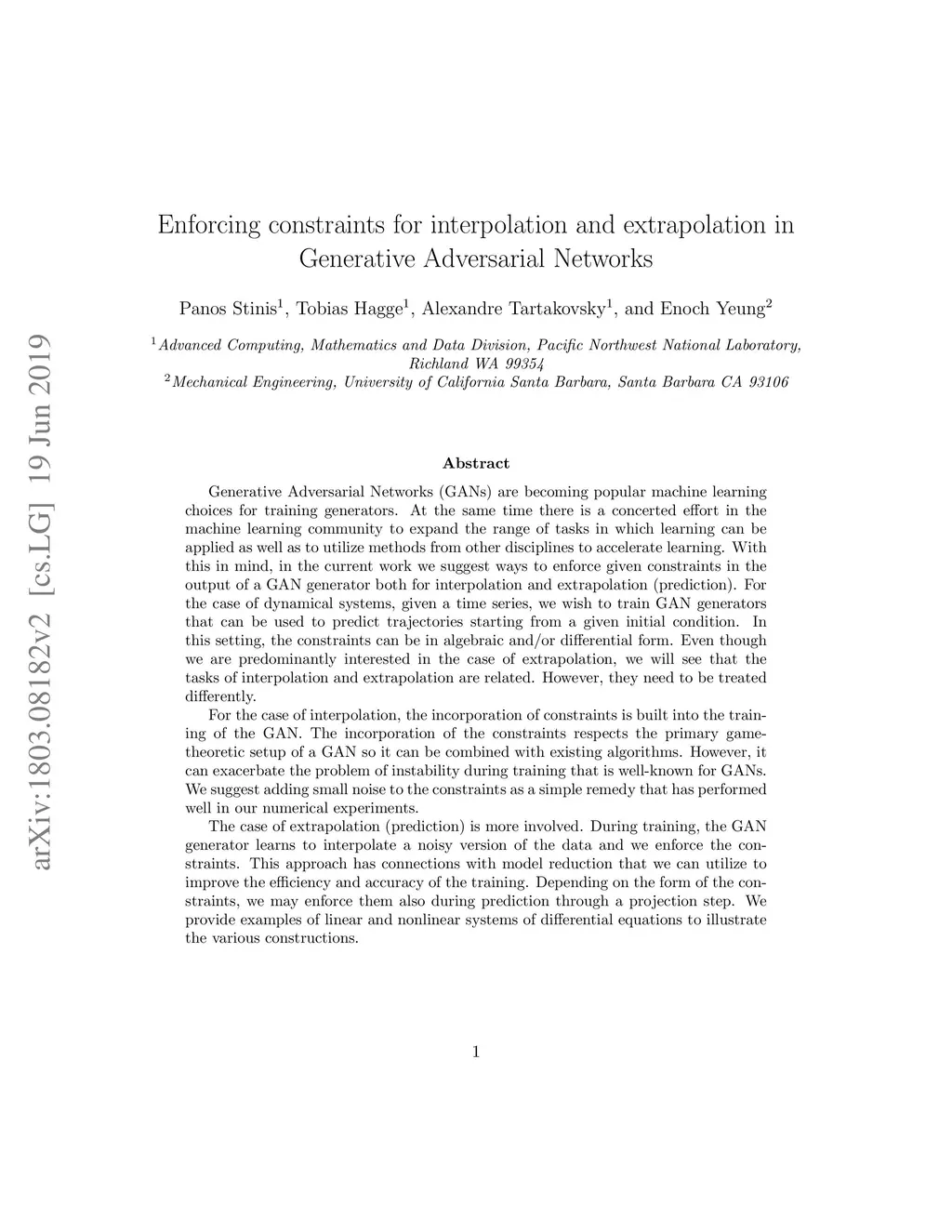 We suggest ways to enforce given constraints in the output of a Generative Adversarial Network (GAN) generator both for interpolation and extrapolation (prediction). For the case of dynamical systems, given a time series, we wish to train GAN generators that can be used to predict trajectories starting from a given initial condition. In this setting, the constraints can be in algebraic and/or differential form. Even though we are predominantly interested in the case of extrapolation, we will see that the tasks of interpolation and extrapolation are related. However, they need to be treated differently. For the case of interpolation, the incorporation of constraints is built into the training of the GAN. The incorporation of the constraints respects the primary game-theoretic setup of a GAN so it can be combined with existing algorithms. However, it can exacerbate the problem of instability during training that is well-known for GANs. We suggest adding small noise to the constraints as a simple remedy that has performed well in our numerical experiments. The case of extrapolation (prediction) is more involved. During training, the GAN generator learns to interpolate a noisy version of the data and we enforce the constraints. This approach has connections with model reduction that we can utilize to improve the efficiency and accuracy of the training. Depending on the form of the constraints, we may enforce them also during prediction through a projection step. We provide examples of linear and nonlinear systems of differential equations to illustrate the various constructions.