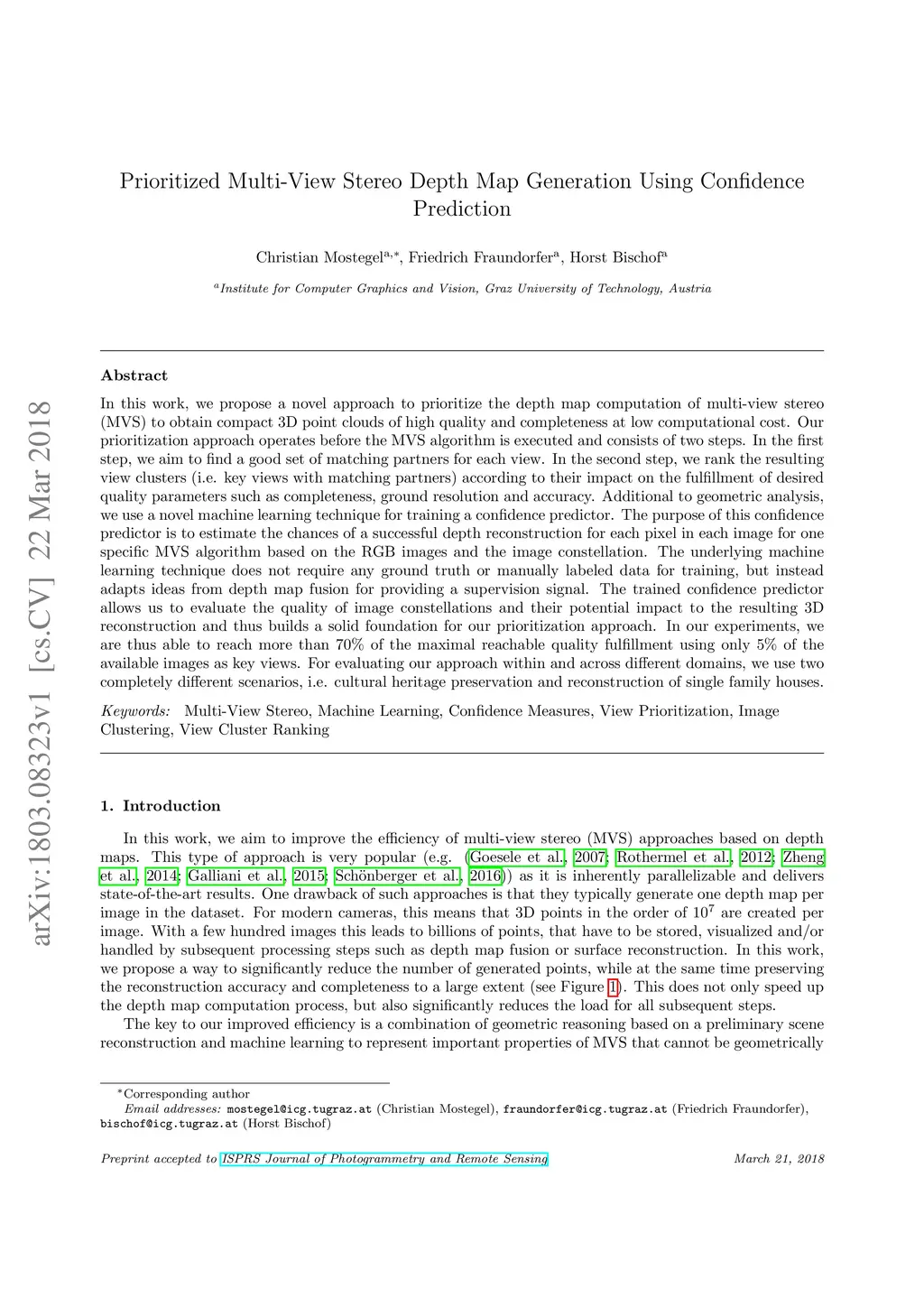 In this work, we propose a novel approach to prioritize the depth map computation of multi-view stereo (MVS) to obtain compact 3D point clouds of high quality and completeness at low computational cost. Our prioritization approach operates before the MVS algorithm is executed and consists of two steps. In the first step, we aim to find a good set of matching partners for each view. In the second step, we rank the resulting view clusters (i.e. key views with matching partners) according to their impact on the fulfillment of desired quality parameters such as completeness, ground resolution and accuracy. Additional to geometric analysis, we use a novel machine learning technique for training a confidence predictor. The purpose of this confidence predictor is to estimate the chances of a successful depth reconstruction for each pixel in each image for one specific MVS algorithm based on the RGB images and the image constellation. The underlying machine learning technique does not require any ground truth or manually labeled data for training, but instead adapts ideas from depth map fusion for providing a supervision signal. The trained confidence predictor allows us to evaluate the quality of image constellations and their potential impact to the resulting 3D reconstruction and thus builds a solid foundation for our prioritization approach. In our experiments, we are thus able to reach more than 70% of the maximal reachable quality fulfillment using only 5% of the available images as key views. For evaluating our approach within and across different domains, we use two completely different scenarios, i.e. cultural heritage preservation and reconstruction of single family houses.