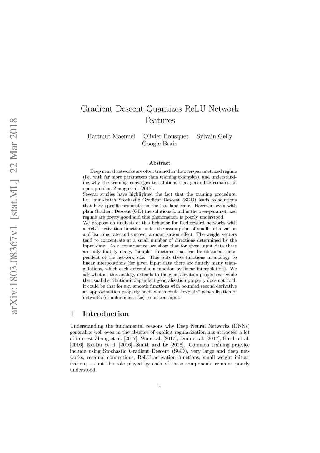 Deep neural networks are often trained in the over-parametrized regime (i.e. with far more parameters than training examples), and understanding why the training converges to solutions that generalize remains an open problem. Several studies have highlighted the fact that the training procedure, i.e. mini-batch Stochastic Gradient Descent (SGD) leads to solutions that have specific properties in the loss landscape. However, even with plain Gradient Descent (GD) the solutions found in the over-parametrized regime are pretty good and this phenomenon is poorly understood. We propose an analysis of this behavior for feedforward networks with a ReLU activation function under the assumption of small initialization and learning rate and uncover a quantization effect: The weight vectors tend to concentrate at a small number of directions determined by the input data. As a consequence, we show that for given input data there are only finitely many, "simple" functions that can be obtained, independent of the network size. This puts these functions in analogy to linear interpolations (for given input data there are finitely many triangulations, which each determine a function by linear interpolation). We ask whether this analogy extends to the generalization properties - while the usual distribution-independent generalization property does not hold, it could be that for e.g. smooth functions with bounded second derivative an approximation property holds which could "explain" generalization of networks (of unbounded size) to unseen inputs.