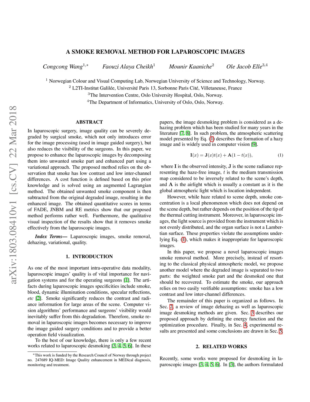 In laparoscopic surgery, image quality can be severely degraded by surgical smoke, which not only introduces error for the image processing (used in image guided surgery), but also reduces the visibility of the surgeons. In this paper, we propose to enhance the laparoscopic images by decomposing them into unwanted smoke part and enhanced part using a variational approach. The proposed method relies on the observation that smoke has low contrast and low inter-channel differences. A cost function is defined based on this prior knowledge and is solved using an augmented Lagrangian method. The obtained unwanted smoke component is then subtracted from the original degraded image, resulting in the enhanced image. The obtained quantitative scores in terms of FADE, JNBM and RE metrics show that our proposed method performs rather well. Furthermore, the qualitative visual inspection of the results show that it removes smoke effectively from the laparoscopic images.