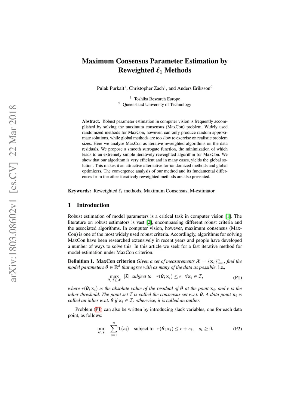 Robust parameter estimation in computer vision is frequently accomplished by solving the maximum consensus (MaxCon) problem. Widely used randomized methods for MaxCon, however, can only produce {random} approximate solutions, while global methods are too slow to exercise on realistic problem sizes. Here we analyse MaxCon as iterative reweighted algorithms on the data residuals. We propose a smooth surrogate function, the minimization of which leads to an extremely simple iteratively reweighted algorithm for MaxCon. We show that our algorithm is very efficient and in many cases, yields the global solution. This makes it an attractive alternative for randomized methods and global optimizers. The convergence analysis of our method and its fundamental differences from the other iteratively reweighted methods are also presented.