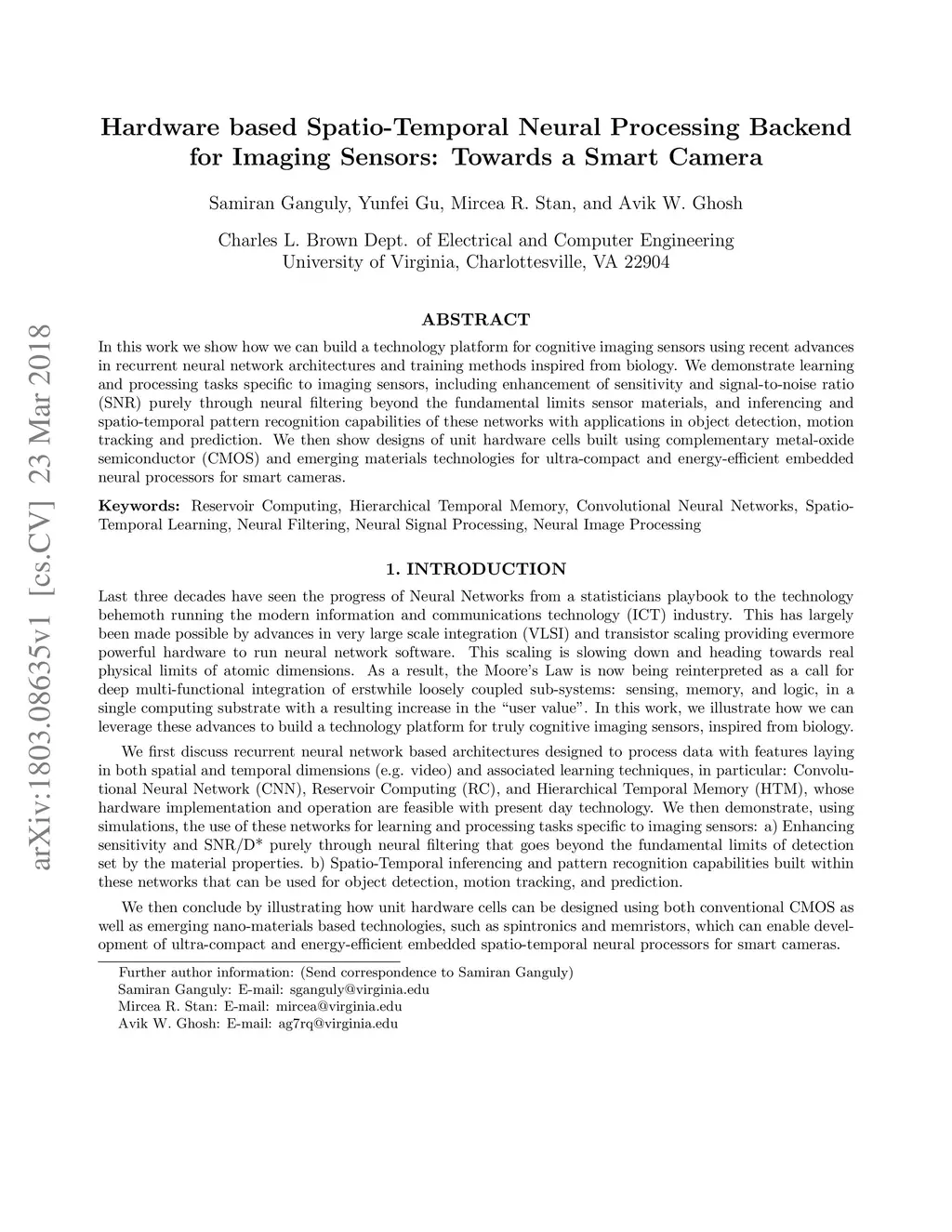 In this work we show how we can build a technology platform for cognitive imaging sensors using recent advances in recurrent neural network architectures and training methods inspired from biology. We demonstrate learning and processing tasks specific to imaging sensors, including enhancement of sensitivity and signal-to-noise ratio (SNR) purely through neural filtering beyond the fundamental limits sensor materials, and inferencing and spatio-temporal pattern recognition capabilities of these networks with applications in object detection, motion tracking and prediction. We then show designs of unit hardware cells built using complementary metal-oxide semiconductor (CMOS) and emerging materials technologies for ultra-compact and energy-efficient embedded neural processors for smart cameras.
