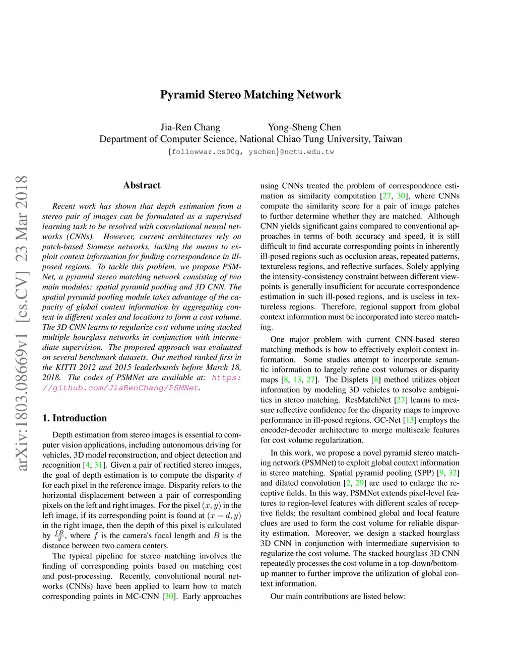 Recent work has shown that depth estimation from a stereo pair of images can be formulated as a supervised learning task to be resolved with convolutional neural networks (CNNs). However, current architectures rely on patch-based Siamese networks, lacking the means to exploit context information for finding correspondence in illposed regions. To tackle this problem, we propose PSMNet, a pyramid stereo matching network consisting of two main modules: spatial pyramid pooling and 3D CNN. The spatial pyramid pooling module takes advantage of the capacity of global context information by aggregating context in different scales and locations to form a cost volume. The 3D CNN learns to regularize cost volume using stacked multiple hourglass networks in conjunction with intermediate supervision. The proposed approach was evaluated on several benchmark datasets. Our method ranked first in the KITTI 2012 and 2015 leaderboards before March 18, 2018. The codes of PSMNet are available at: https://github.com/JiaRenChang/PSMNet.