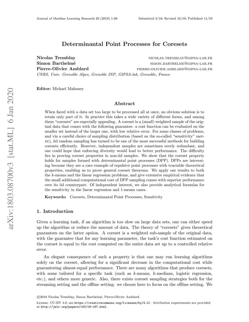When faced with a data set too large to be processed all at once, an obvious solution is to retain only part of it. In practice this takes a wide variety of different forms, and among them "coresets" are especially appealing. A coreset is a (small) weighted sample of the original data that comes with the following guarantee: a cost function can be evaluated on the smaller set instead of the larger one, with low relative error. For some classes of problems, and via a careful choice of sampling distribution (based on the so-called "sensitivity" metric), iid random sampling has turned to be one of the most successful methods for building coresets efficiently. However, independent samples are sometimes overly redundant, and one could hope that enforcing diversity would lead to better performance. The difficulty lies in proving coreset properties in non-iid samples. We show that the coreset property holds for samples formed with determinantal point processes (DPP). DPPs are interesting because they are a rare example of repulsive point processes with tractable theoretical properties, enabling us to prove general coreset theorems. We apply our results to both the k-means and the linear regression problems, and give extensive empirical evidence that the small additional computational cost of DPP sampling comes with superior performance over its iid counterpart. Of independent interest, we also provide analytical formulas for the sensitivity in the linear regression and 1-means cases.