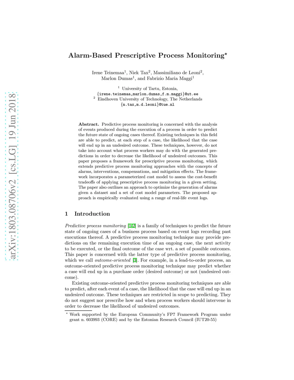 Predictive process monitoring is concerned with the analysis of events produced during the execution of a process in order to predict the future state of ongoing cases thereof. Existing techniques in this field are able to predict, at each step of a case, the likelihood that the case will end up in an undesired outcome. These techniques, however, do not take into account what process workers may do with the generated predictions in order to decrease the likelihood of undesired outcomes. This paper proposes a framework for prescriptive process monitoring, which extends predictive process monitoring approaches with the concepts of alarms, interventions, compensations, and mitigation effects. The framework incorporates a parameterized cost model to assess the cost-benefit tradeoffs of applying prescriptive process monitoring in a given setting. The paper also outlines an approach to optimize the generation of alarms given a dataset and a set of cost model parameters. The proposed approach is empirically evaluated using a range of real-life event logs.