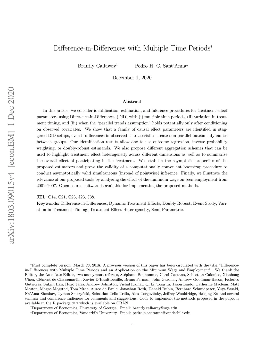 In this article, we consider identification, estimation, and inference procedures for treatment effect parameters using Difference-in-Differences (DiD) with (i) multiple time periods, (ii) variation in treatment timing, and (iii) when the "parallel trends assumption" holds potentially only after conditioning on observed covariates. We show that a family of causal effect parameters are identified in staggered DiD setups, even if differences in observed characteristics create non-parallel outcome dynamics between groups. Our identification results allow one to use outcome regression, inverse probability weighting, or doubly-robust estimands. We also propose different aggregation schemes that can be used to highlight treatment effect heterogeneity across different dimensions as well as to summarize the overall effect of participating in the treatment. We establish the asymptotic properties of the proposed estimators and prove the validity of a computationally convenient bootstrap procedure to conduct asymptotically valid simultaneous (instead of pointwise) inference. Finally, we illustrate the relevance of our proposed tools by analyzing the effect of the minimum wage on teen employment from 2001--2007. Open-source software is available for implementing the proposed methods.