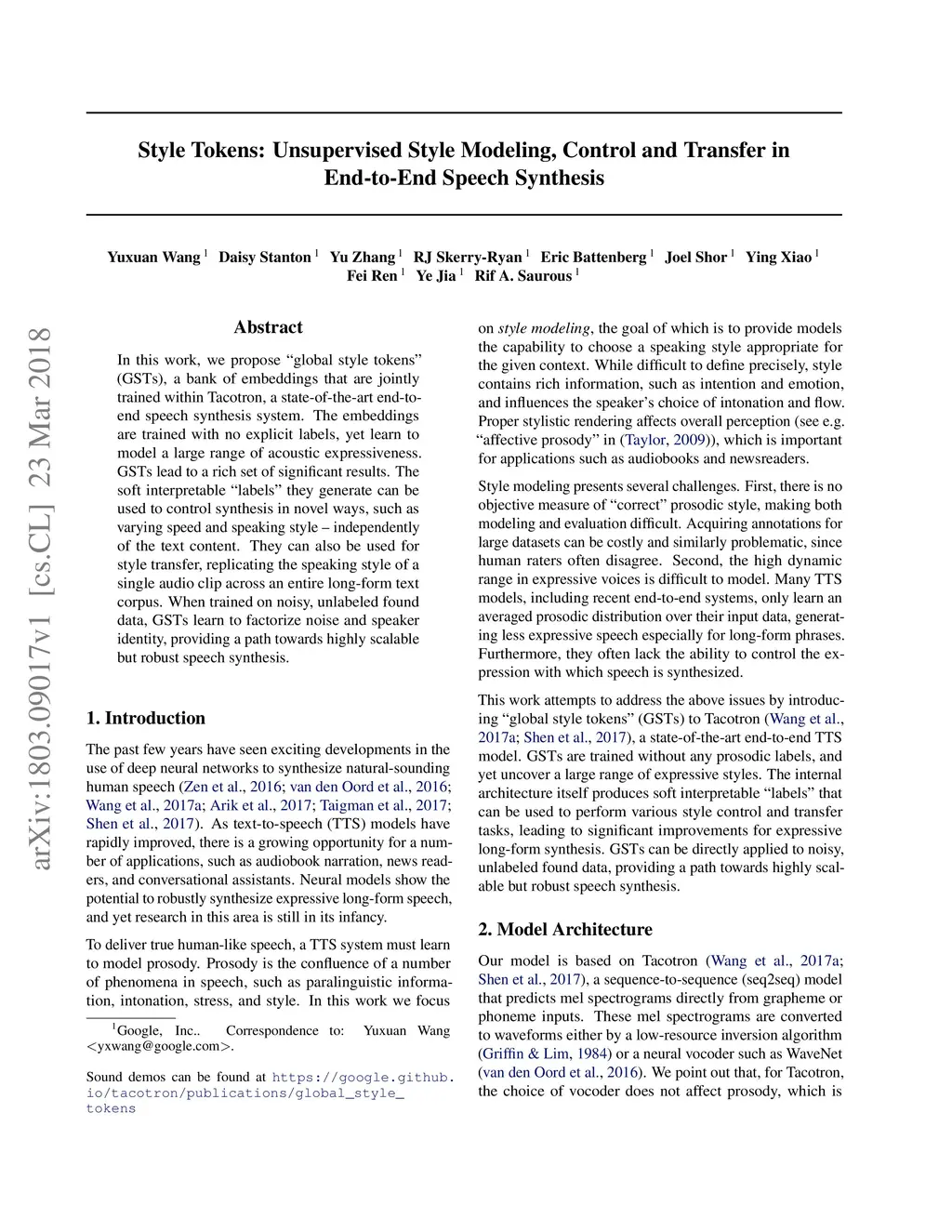Style Tokens: Unsupervised Style Modeling, Control and Transfer in