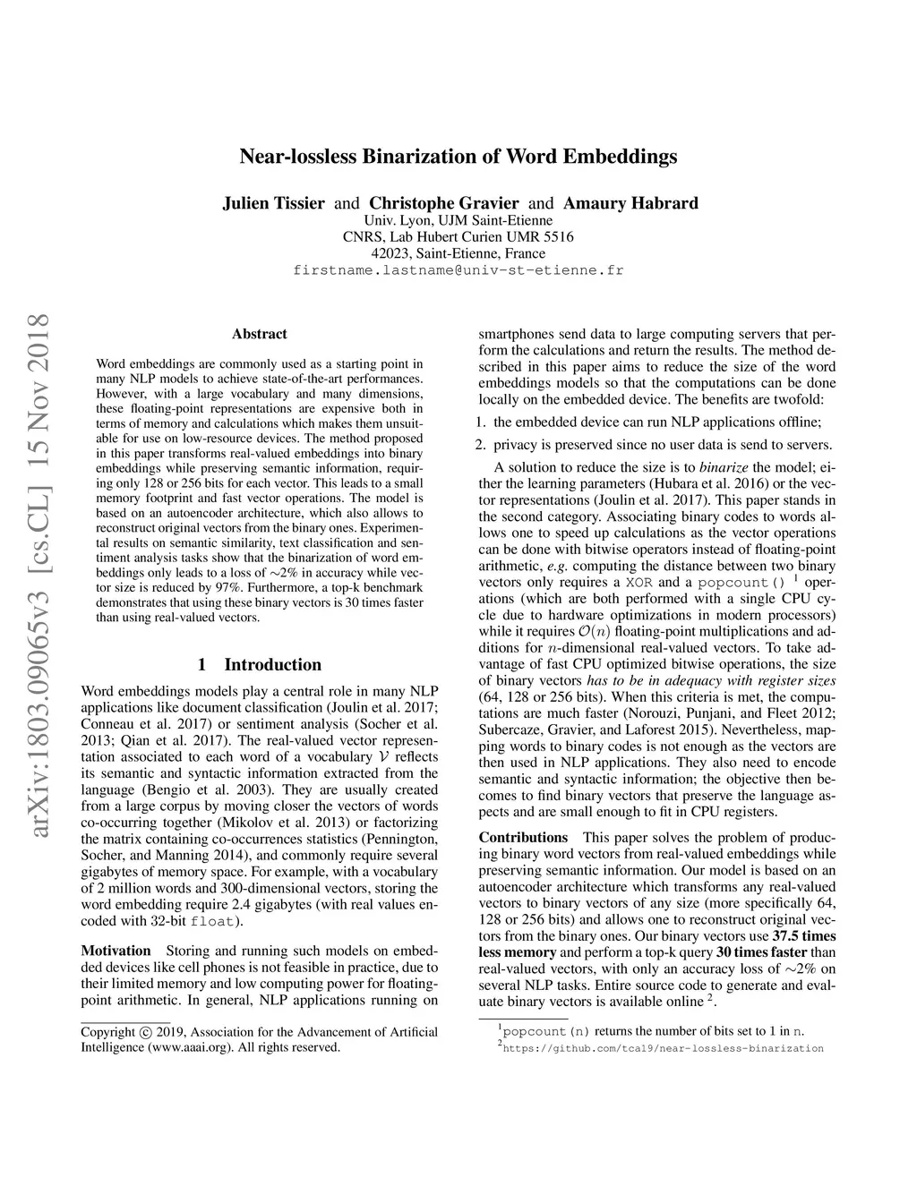 Near-lossless Binarization of Word Embeddings