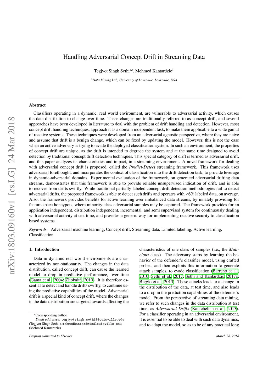 Classifiers operating in a dynamic, real world environment, are vulnerable to adversarial activity, which causes the data distribution to change over time. These changes are traditionally referred to as concept drift, and several approaches have been developed in literature to deal with the problem of drift handling and detection. However, most concept drift handling techniques, approach it as a domain independent task, to make them applicable to a wide gamut of reactive systems. These techniques were developed from an adversarial agnostic perspective, where they are naive and assume that drift is a benign change, which can be fixed by updating the model. However, this is not the case when an active adversary is trying to evade the deployed classification system. In such an environment, the properties of concept drift are unique, as the drift is intended to degrade the system and at the same time designed to avoid detection by traditional concept drift detection techniques. This special category of drift is termed as adversarial drift, and this paper analyzes its characteristics and impact, in a streaming environment. A novel framework for dealing with adversarial concept drift is proposed, called the Predict-Detect streaming framework. Experimental evaluation of the framework, on generated adversarial drifting data streams, demonstrates that this framework is able to provide reliable unsupervised indication of drift, and is able to recover from drifts swiftly. While traditional partially labeled concept drift detection methodologies fail to detect adversarial drifts, the proposed framework is able to detect such drifts and operates with <6% labeled data, on average. Also, the framework provides benefits for active learning over imbalanced data streams, by innately providing for feature space honeypots, where minority class adversarial samples may be captured.
