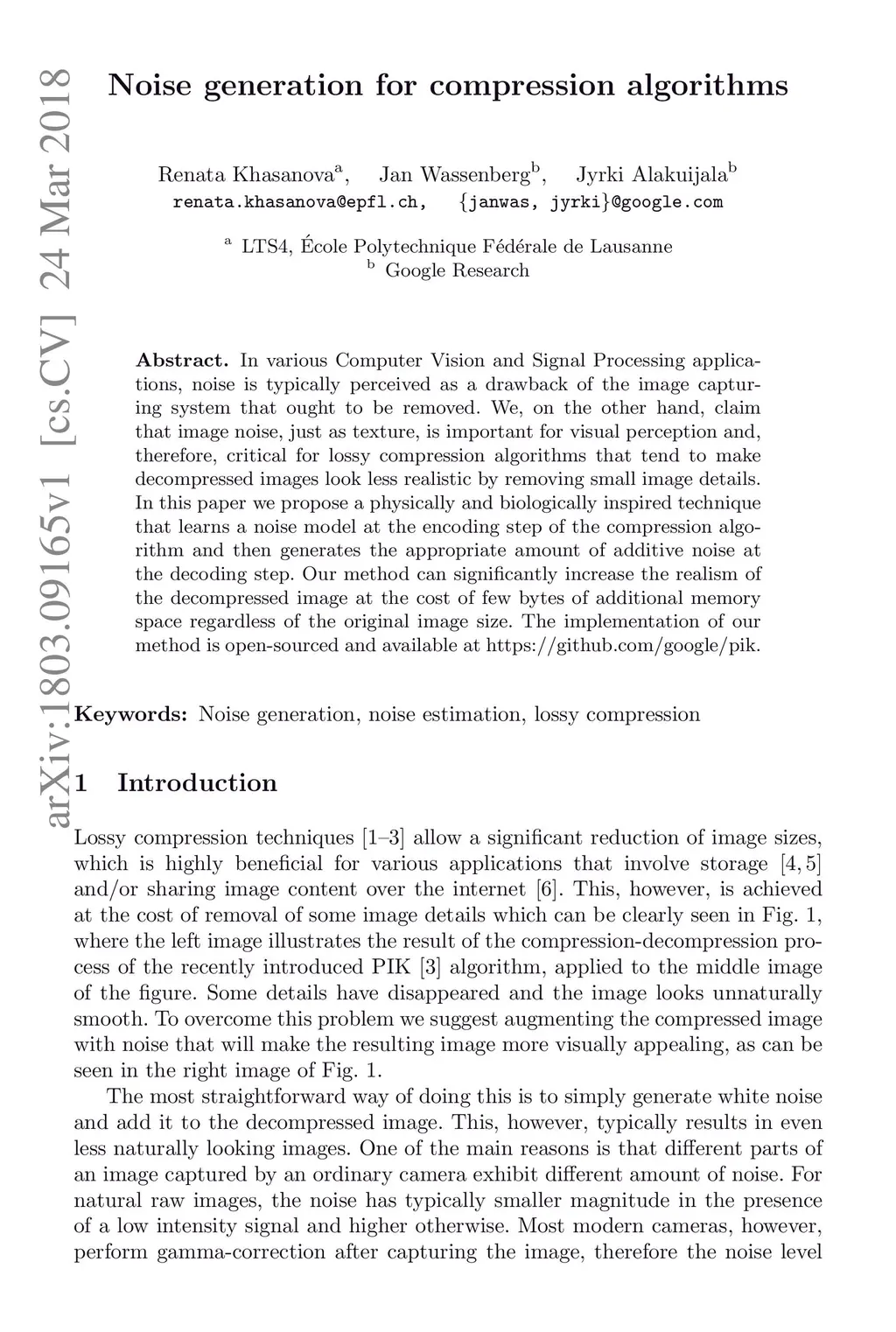 In various Computer Vision and Signal Processing applications, noise is typically perceived as a drawback of the image capturing system that ought to be removed. We, on the other hand, claim that image noise, just as texture, is important for visual perception and, therefore, critical for lossy compression algorithms that tend to make decompressed images look less realistic by removing small image details. In this paper we propose a physically and biologically inspired technique that learns a noise model at the encoding step of the compression algorithm and then generates the appropriate amount of additive noise at the decoding step. Our method can significantly increase the realism of the decompressed image at the cost of few bytes of additional memory space regardless of the original image size. The implementation of our method is open-sourced and available at https://github.com/google/pik.