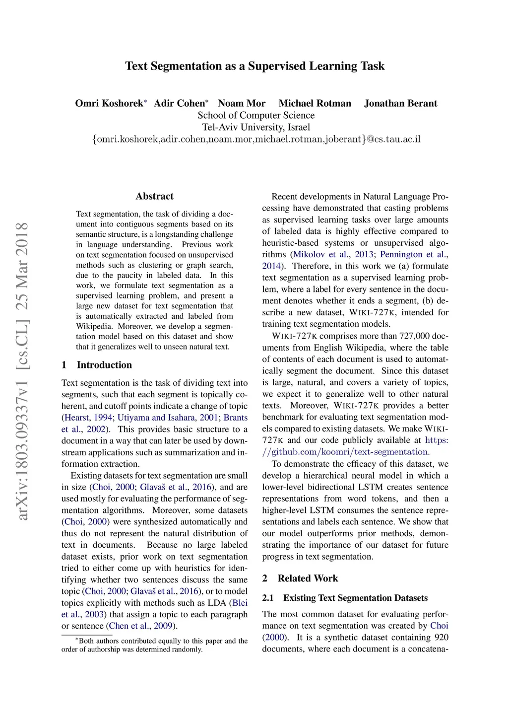 Text segmentation, the task of dividing a document into contiguous segments based on its semantic structure, is a longstanding challenge in language understanding. Previous work on text segmentation focused on unsupervised methods such as clustering or graph search, due to the paucity in labeled data. In this work, we formulate text segmentation as a supervised learning problem, and present a large new dataset for text segmentation that is automatically extracted and labeled from Wikipedia. Moreover, we develop a segmentation model based on this dataset and show that it generalizes well to unseen natural text.