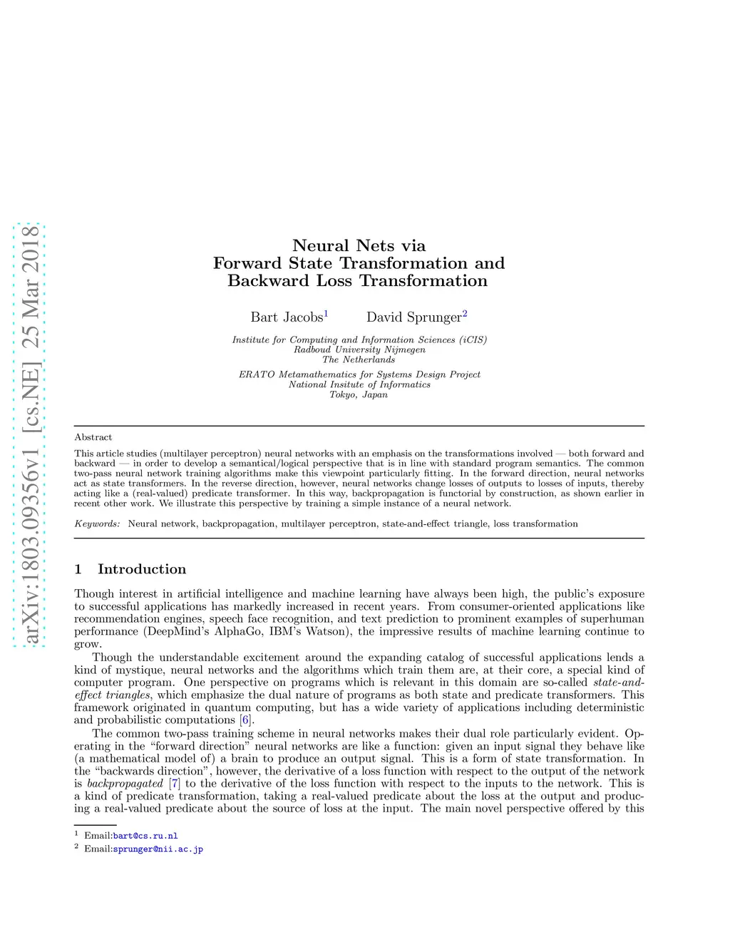 Neural Nets via Forward State Transformation and Backward Loss