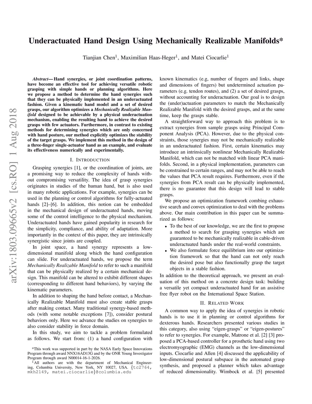 Underactuated Hand Design Using Mechanically Realizable Manifolds