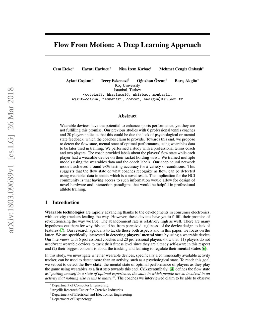 Wearable devices have the potential to enhance sports performance, yet they are not fulfilling this promise. Our previous studies with 6 professional tennis coaches and 20 players indicate that this could be due the lack of psychological or mental state feedback, which the coaches claim to provide. Towards this end, we propose to detect the flow state, mental state of optimal performance, using wearables data to be later used in training. We performed a study with a professional tennis coach and two players. The coach provided labels about the players' flow state while each player had a wearable device on their racket holding wrist. We trained multiple models using the wearables data and the coach labels. Our deep neural network models achieved around 98% testing accuracy for a variety of conditions. This suggests that the flow state or what coaches recognize as flow, can be detected using wearables data in tennis which is a novel result. The implication for the HCI community is that having access to such information would allow for design of novel hardware and interaction paradigms that would be helpful in professional athlete training.