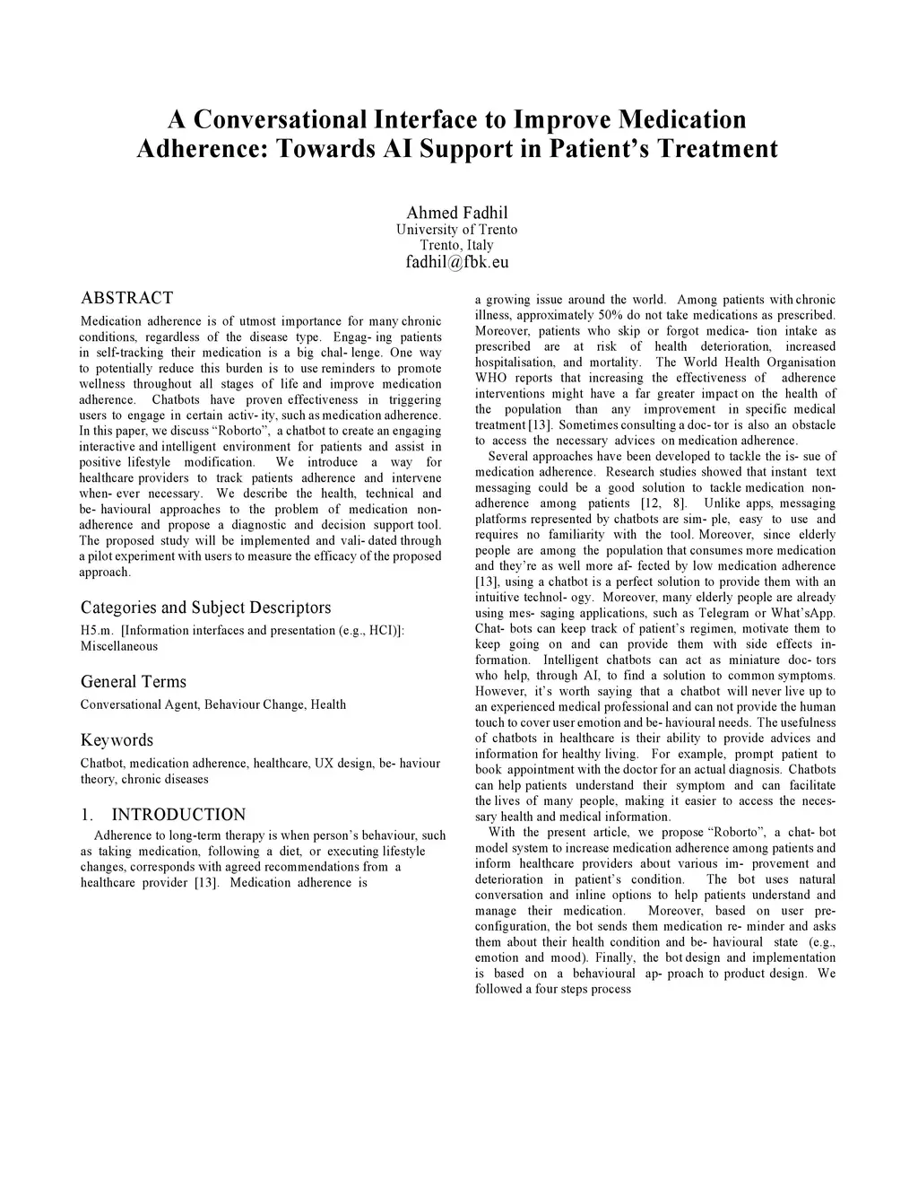 Medication adherence is of utmost importance for many chronic conditions, regardless of the disease type. Engaging patients in self-tracking their medication is a big challenge. One way to potentially reduce this burden is to use reminders to promote wellness throughout all stages of life and improve medication adherence. Chatbots have proven effectiveness in triggering users to engage in certain activity, such as medication adherence. In this paper, we discuss "Roborto", a chatbot to create an engaging interactive and intelligent environment for patients and assist in positive lifestyle modification. We introduce a way for healthcare providers to track patients adherence and intervene whenever necessary. We describe the health, technical and behavioural approaches to the problem of medication non-adherence and propose a diagnostic and decision support tool. The proposed study will be implemented and validated through a pilot experiment with users to measure the efficacy of the proposed approach.