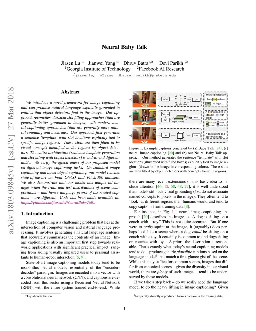 We introduce a novel framework for image captioning that can produce natural language explicitly grounded in entities that object detectors find in the image. Our approach reconciles classical slot filling approaches (that are generally better grounded in images) with modern neural captioning approaches (that are generally more natural sounding and accurate). Our approach first generates a sentence `template' with slot locations explicitly tied to specific image regions. These slots are then filled in by visual concepts identified in the regions by object detectors. The entire architecture (sentence template generation and slot filling with object detectors) is end-to-end differentiable. We verify the effectiveness of our proposed model on different image captioning tasks. On standard image captioning and novel object captioning, our model reaches state-of-the-art on both COCO and Flickr30k datasets. We also demonstrate that our model has unique advantages when the train and test distributions of scene compositions -- and hence language priors of associated captions -- are different. Code has been made available at: https://github.com/jiasenlu/NeuralBabyTalk