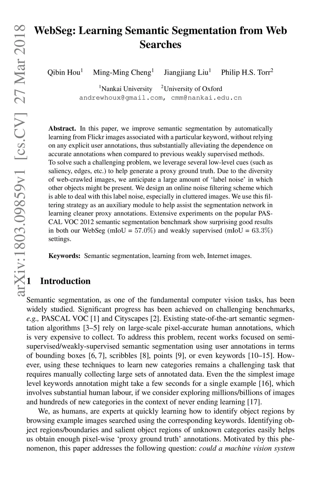 In this paper, we improve semantic segmentation by automatically learning from Flickr images associated with a particular keyword, without relying on any explicit user annotations, thus substantially alleviating the dependence on accurate annotations when compared to previous weakly supervised methods. To solve such a challenging problem, we leverage several low-level cues (such as saliency, edges, etc.) to help generate a proxy ground truth. Due to the diversity of web-crawled images, we anticipate a large amount of 'label noise' in which other objects might be present. We design an online noise filtering scheme which is able to deal with this label noise, especially in cluttered images. We use this filtering strategy as an auxiliary module to help assist the segmentation network in learning cleaner proxy annotations. Extensive experiments on the popular PASCAL VOC 2012 semantic segmentation benchmark show surprising good results in both our WebSeg (mIoU = 57.0%) and weakly supervised (mIoU = 63.3%) settings.