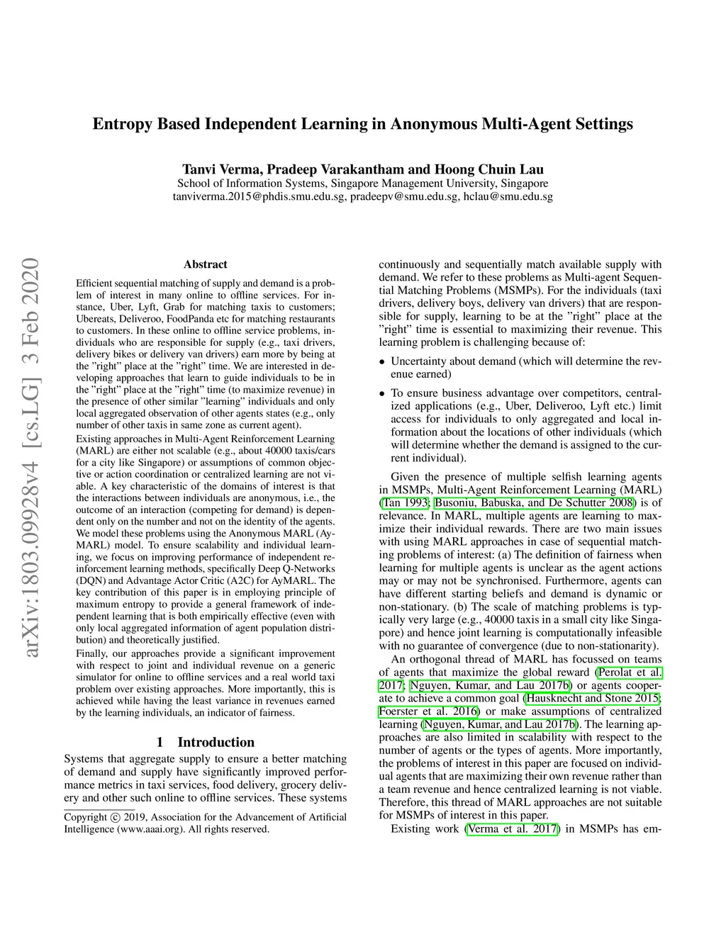 Efficient sequential matching of supply and demand is a problem of interest in many online to offline services. For instance, Uber, Lyft, Grab for matching taxis to customers; Ubereats, Deliveroo, FoodPanda etc for matching restaurants to customers. In these online to offline service problems, individuals who are responsible for supply (e.g., taxi drivers, delivery bikes or delivery van drivers) earn more by being at the "right" place at the "right" time. We are interested in developing approaches that learn to guide individuals to be in the "right" place at the "right" time (to maximize revenue) in the presence of other similar "learning" individuals and only local aggregated observation of other agents states (e.g., only number of other taxis in same zone as current agent). A key characteristic of the domains of interest is that the interactions between individuals are anonymous, i.e., the outcome of an interaction (competing for demand) is dependent only on the number and not on the identity of the agents. We model these problems using the Anonymous MARL (AyMARL) model. The key contribution of this paper is in employing principle of maximum entropy to provide a general framework of independent learning that is both empirically effective (even with only local aggregated information of agent population distribution) and theoretically justified. Finally, our approaches provide a significant improvement with respect to joint and individual revenue on a generic simulator for online to offline services and a real world taxi problem over existing approaches. More importantly, this is achieved while having the least variance in revenues earned by the learning individuals, an indicator of fairness.