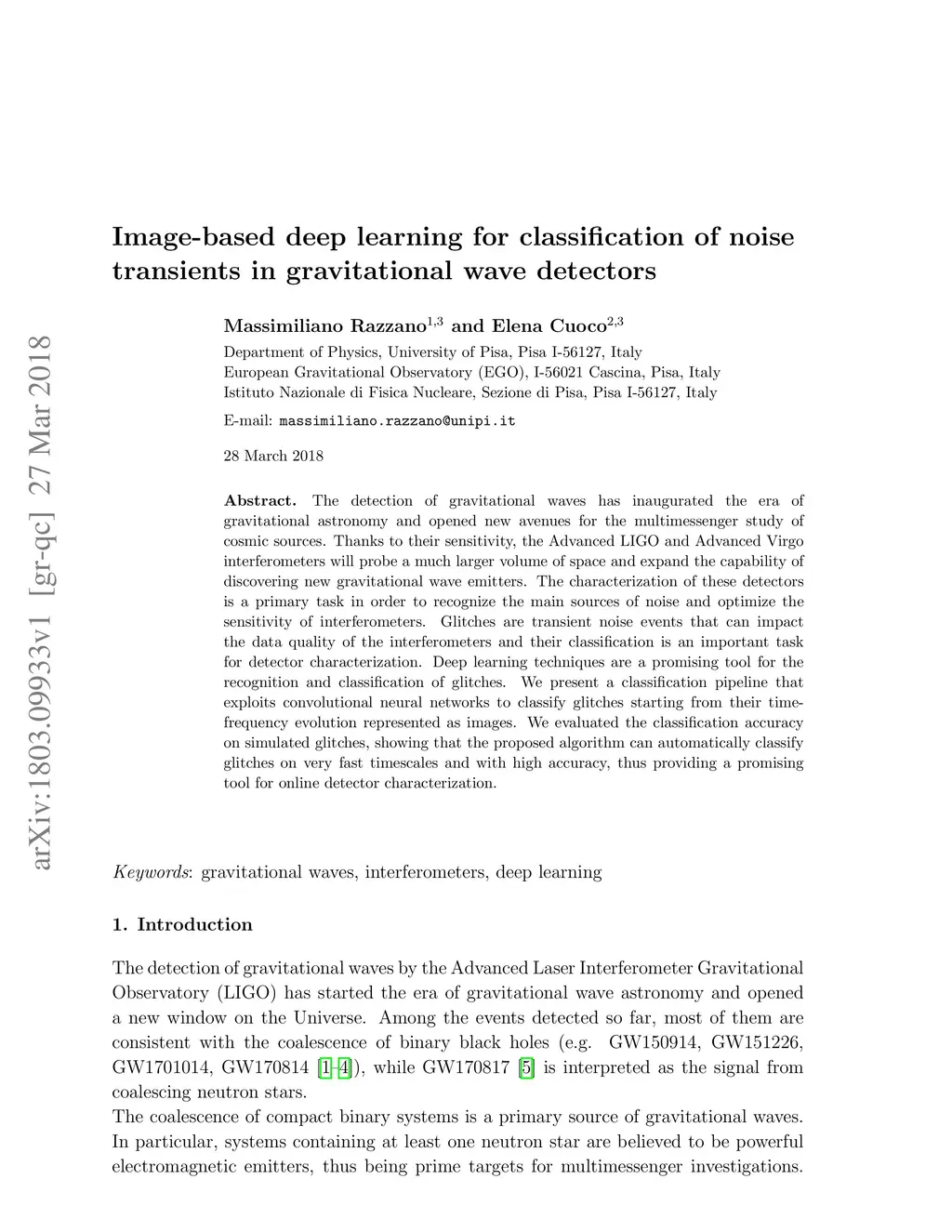 Image-based deep learning for classification of noise transients in